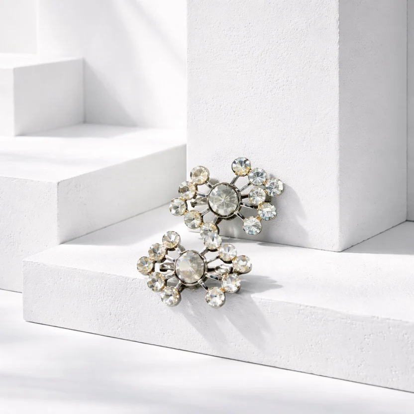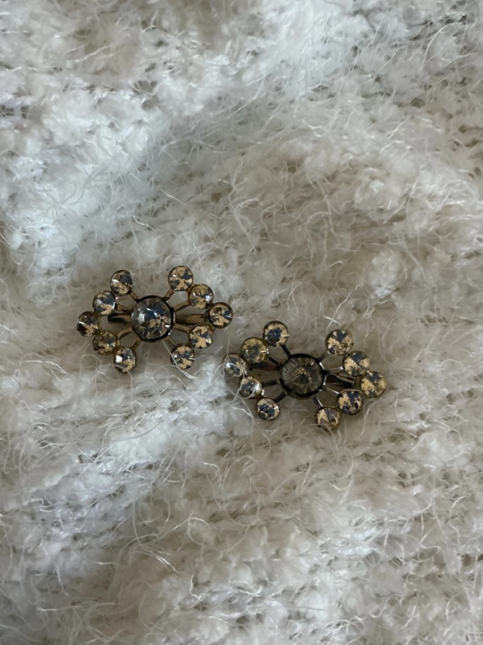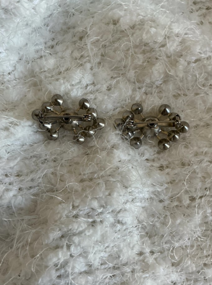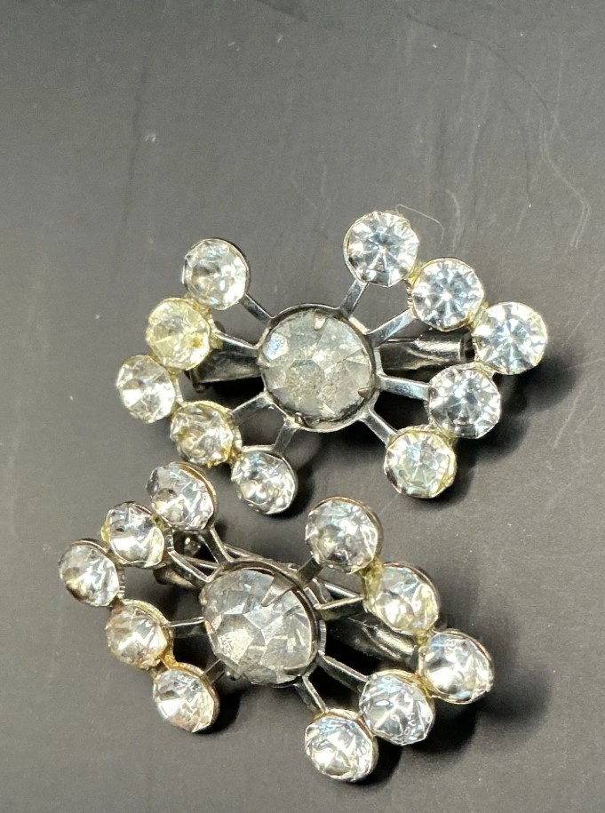Add a touch of retro celestial glamour to your wardrobe with these 1950s atomic starburst fur clips. These versatile clips feature a sparkling clear rhinestone cluster arranged in a starburst or “sputnik” design on a silver-tone metal base.