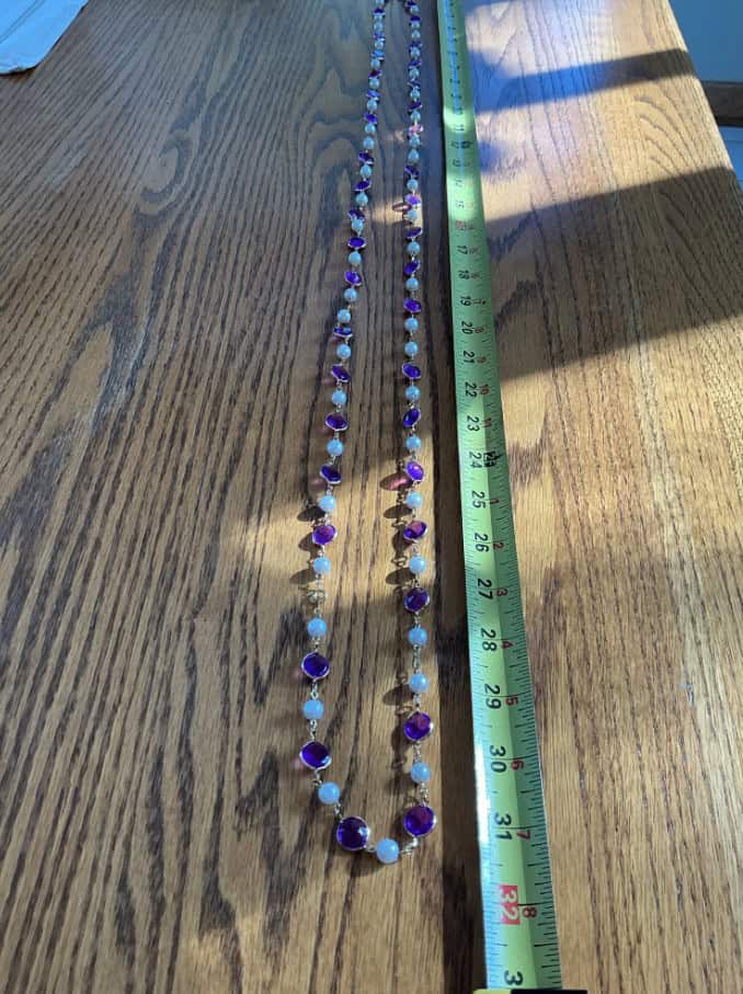 • Classic Pearl Pairing: Interspersed with creamy faux white pearls, creating a timeless contrast against the deep purple hues.