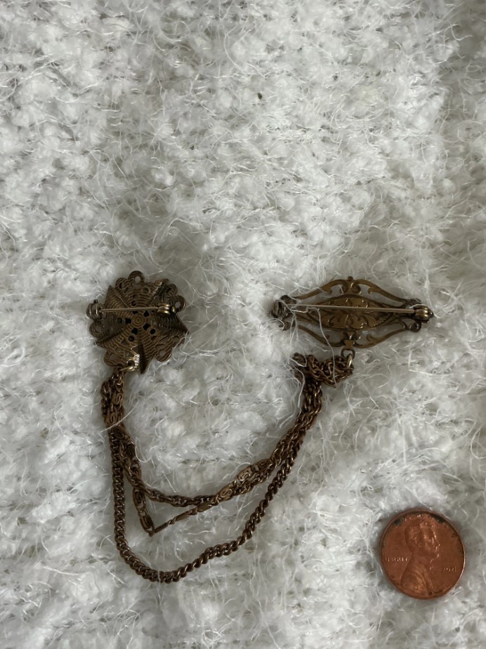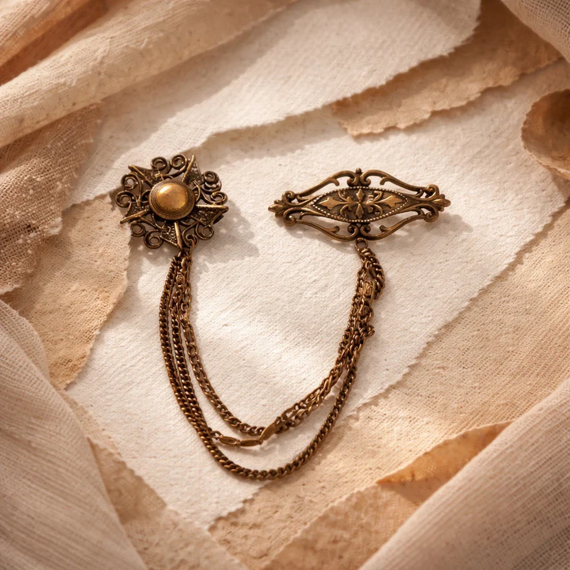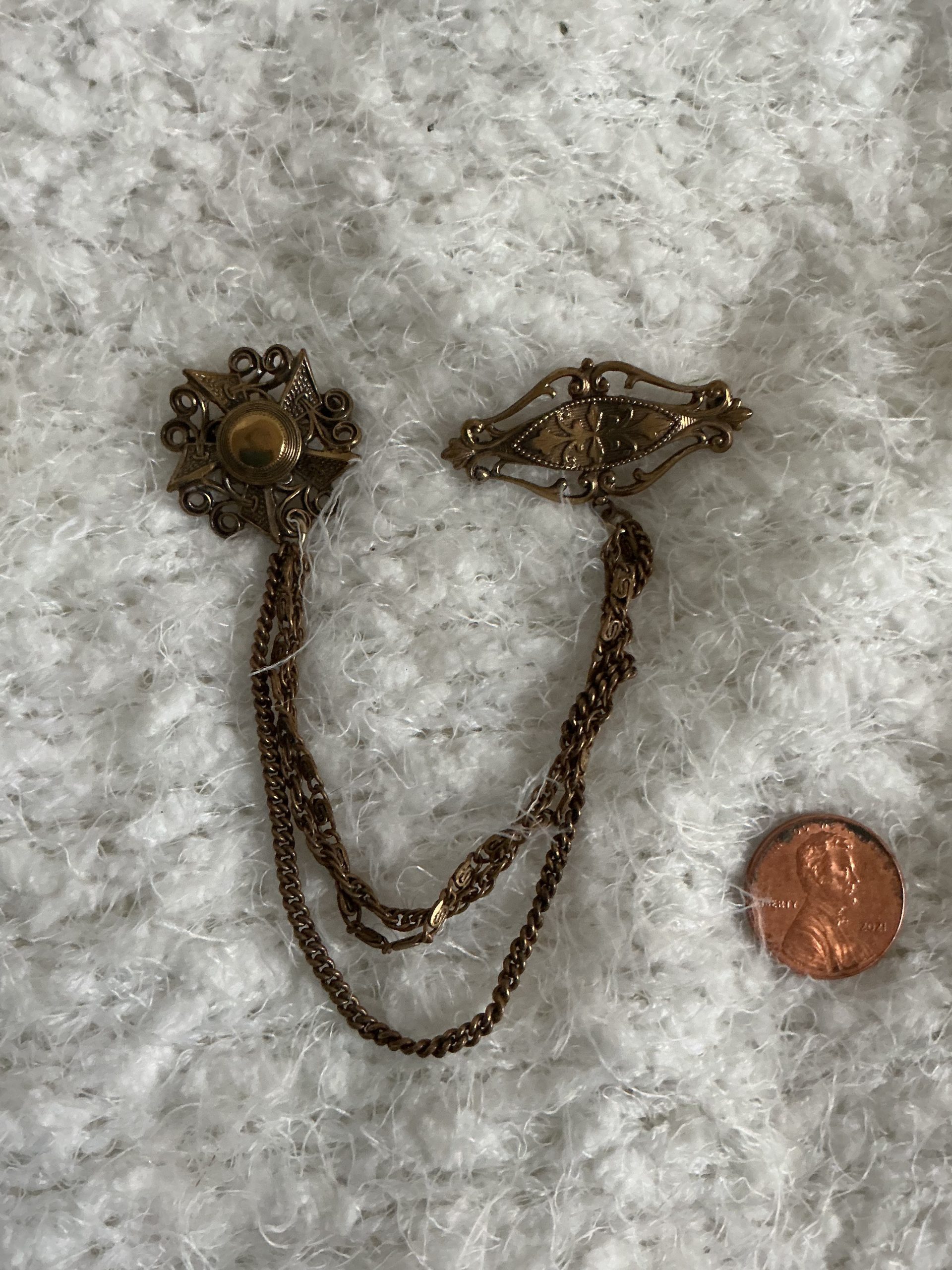 Add a touch of vintage elegance to your wardrobe with this ornate brass sweater guard. This piece features two distinct filigree pins—one circular sunburst design and one elongated navette shape—connected by a decorative triple-strand draping chain. Perfect for securing cardigans, capes, or shawls without buttons, or simply as a statement collar accessory.