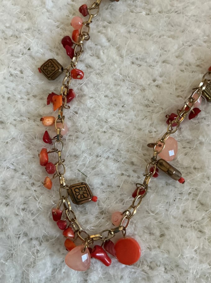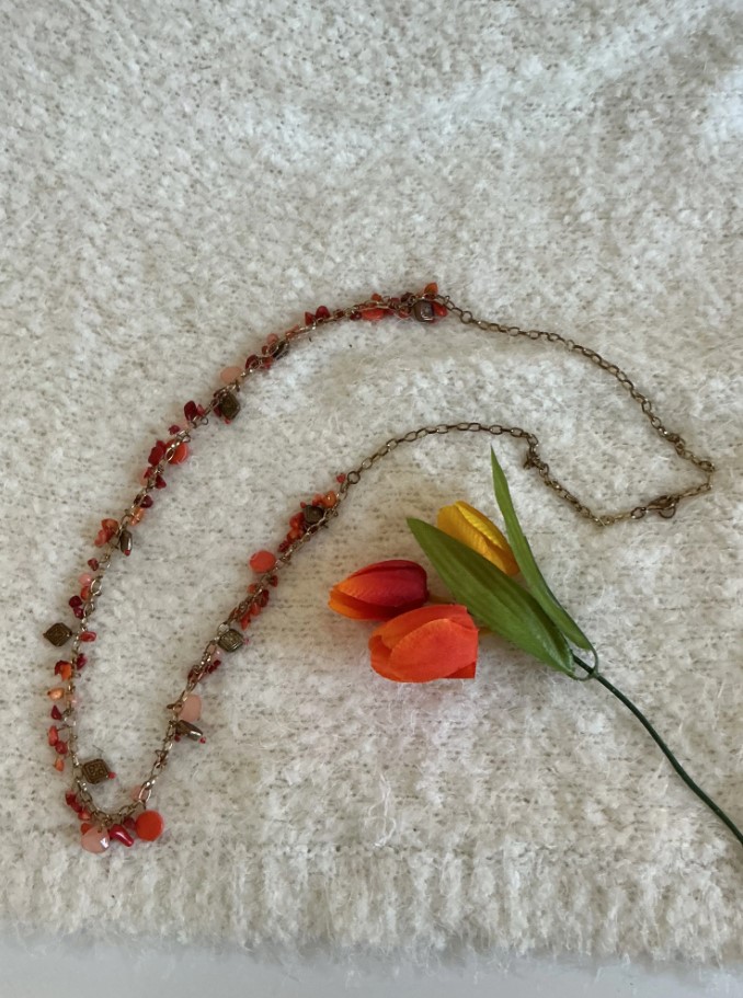 Make a bold statement with this stunning bohemian-style multi-strand necklace. This piece features vibrant red and peach-toned beads accented by antique bronze-finished floral charms. A perfect accessory for a Western, Boho-chic, or eclectic look!