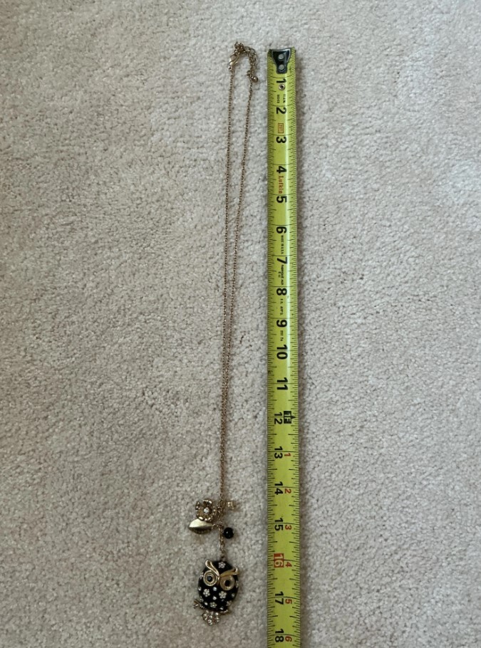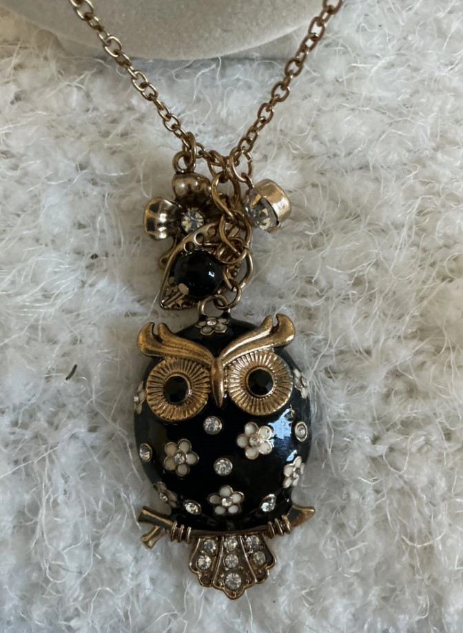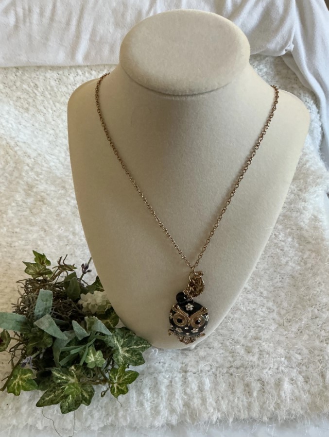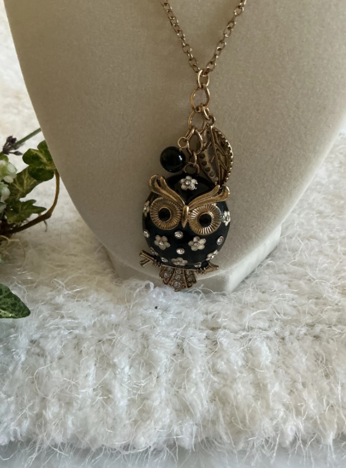 Add a touch of whimsical charm to your jewelry collection with this beautiful vintage-style owl necklace. The pendant features a striking black enamel finish decorated with delicate white and gold floral patterns and clear rhinestone “polka dots.”