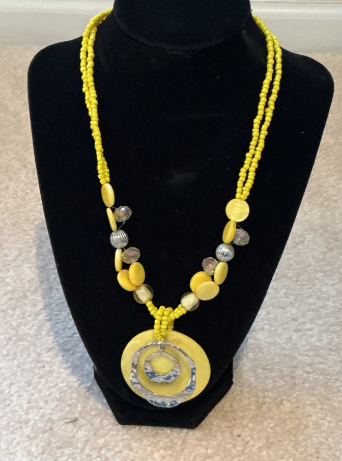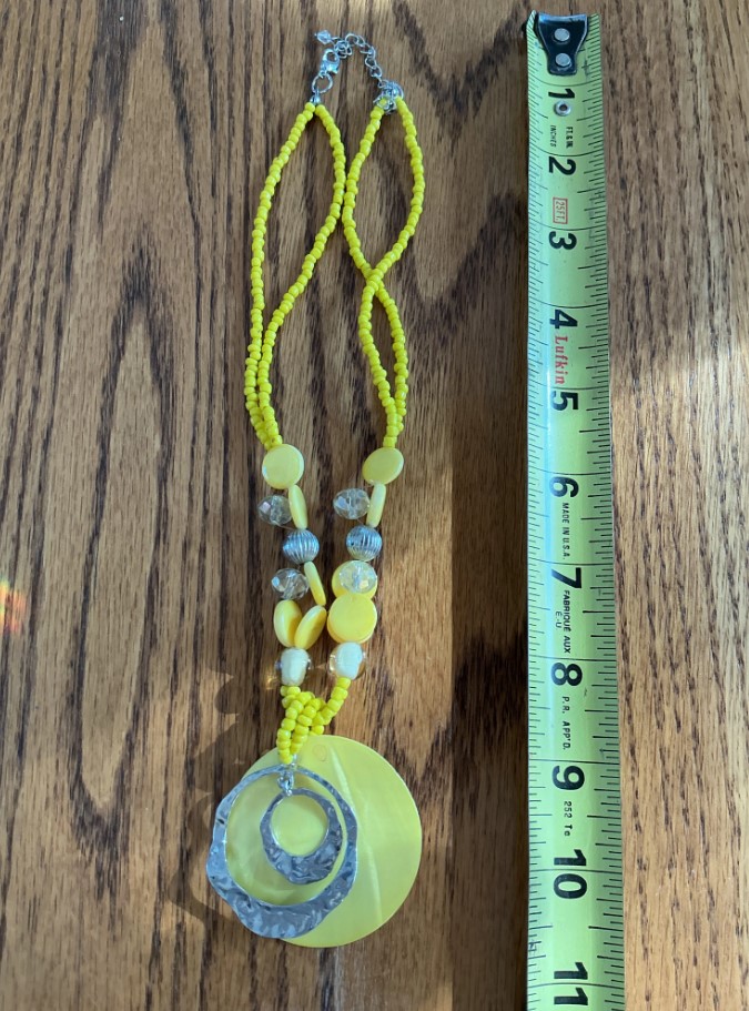 • Textured Beading: The necklace features a double strand of tiny yellow seed beads that transition into larger, flat “coin” beads and faceted clear glass spacers.