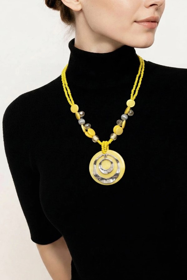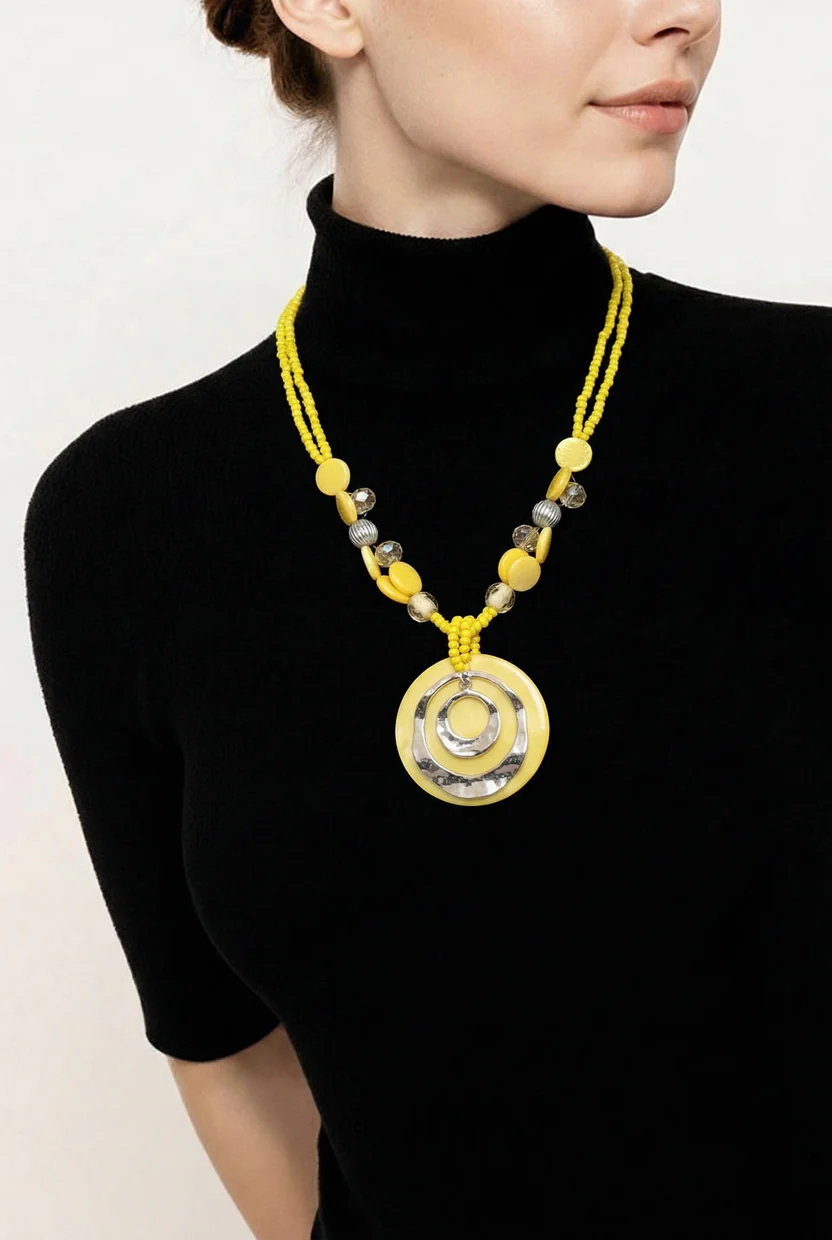 • Artistic Focal Pendant: A large, smooth yellow resin disc serves as the backdrop for two nested, hammered silver-tone rings. The organic, uneven shape of the rings gives the piece a modern, artisanal edge.