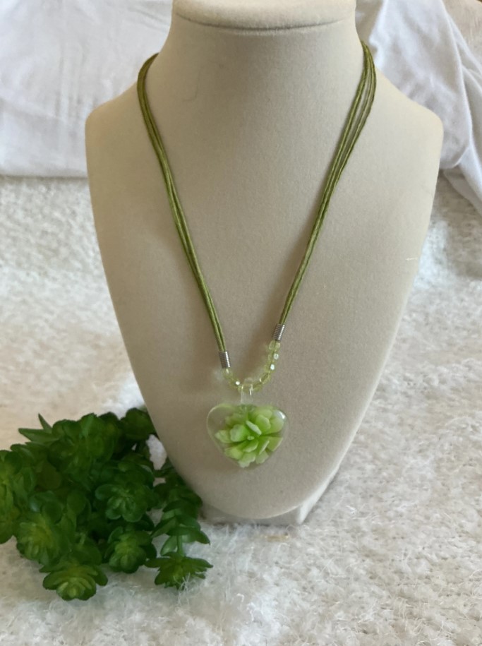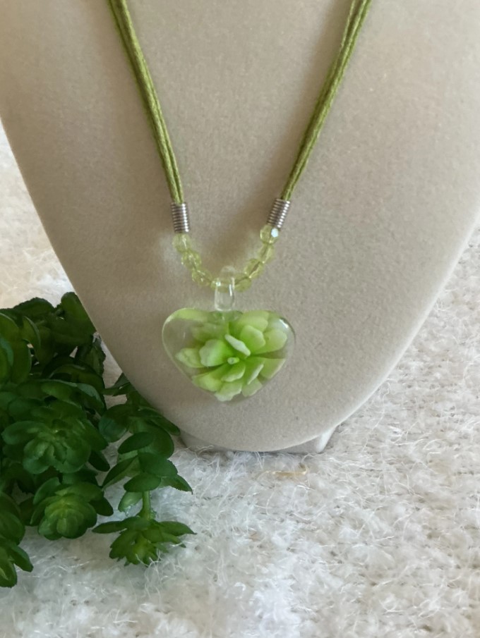 • Pendant: Clear “puffy” heart containing a highly detailed, hand-crafted lime green succulent.