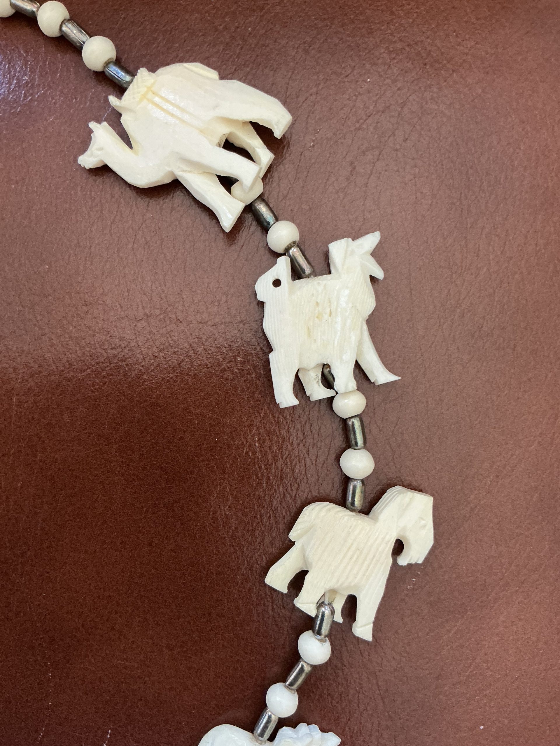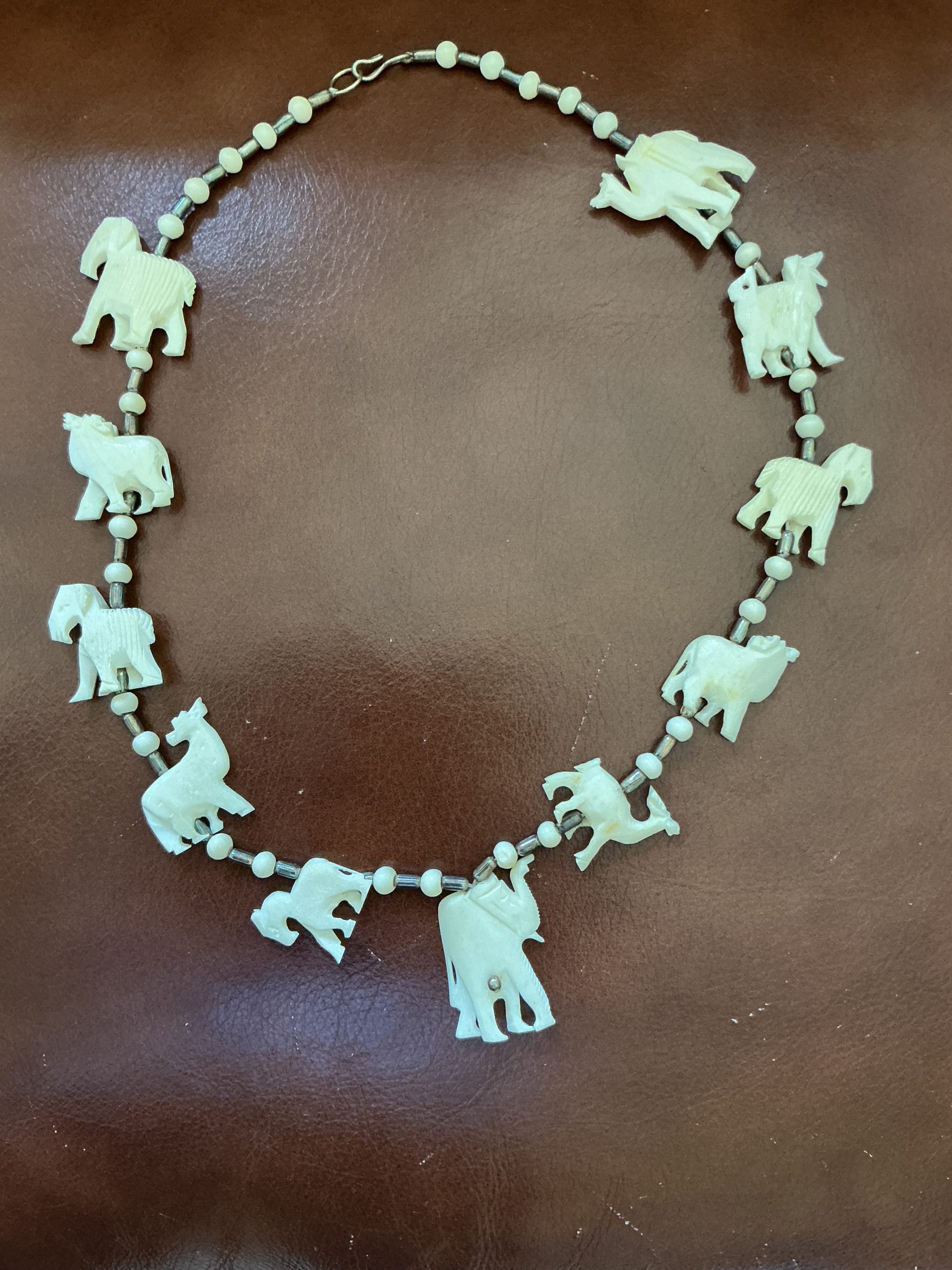 This charming vintage necklace features a collection of hand-carved animal ‘fetishes’ crafted from natural bovine bone. The detailed figures—including an elephant, camel, lion, and more—are separated by polished cream beads and silver-tone metal spacers. It finished with a classic S-hook clasp. A beautiful statement piece for lovers of bohemian, tribal, or Southwestern-style jewelry.”