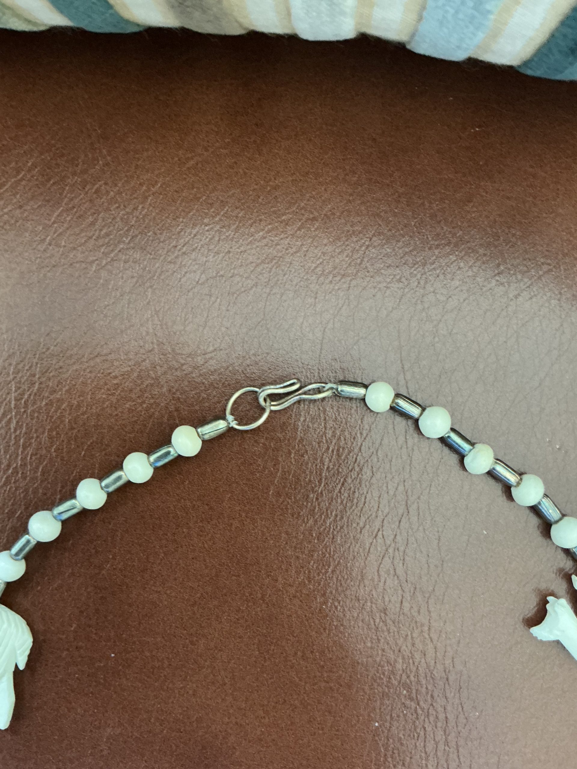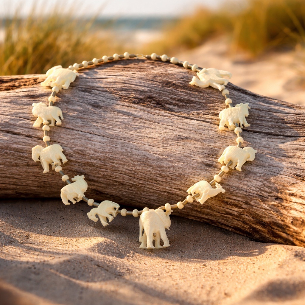 - Condition: Excellent vintage condition. The bone has a natural creamy-white patina with visible hand-carved details. The stringing appears secure with a functional metal clasp.