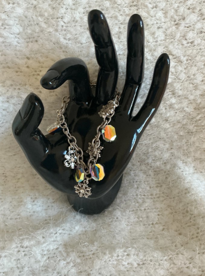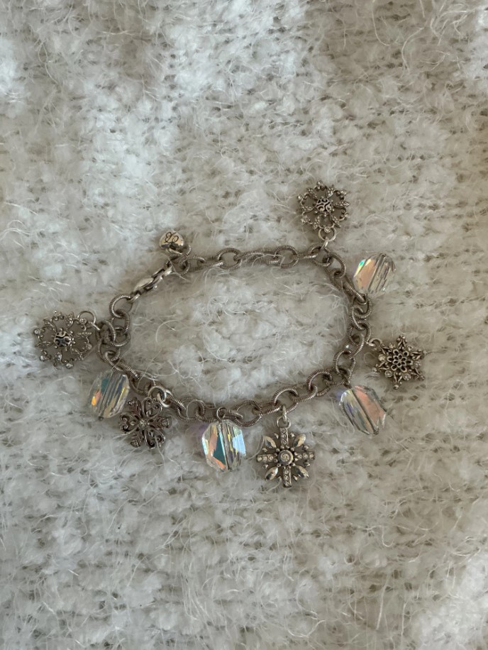 Celebrate the magic of winter with this stunning Brighton charm bracelet. Part of a retired holiday collection, this piece features intricate, double-sided snowflake charms and radiant Aurora Borealis (AB) prism beads. It’s a perfect accessory for the holiday season or a thoughtful gift for a collector of vintage Brighton jewelry.