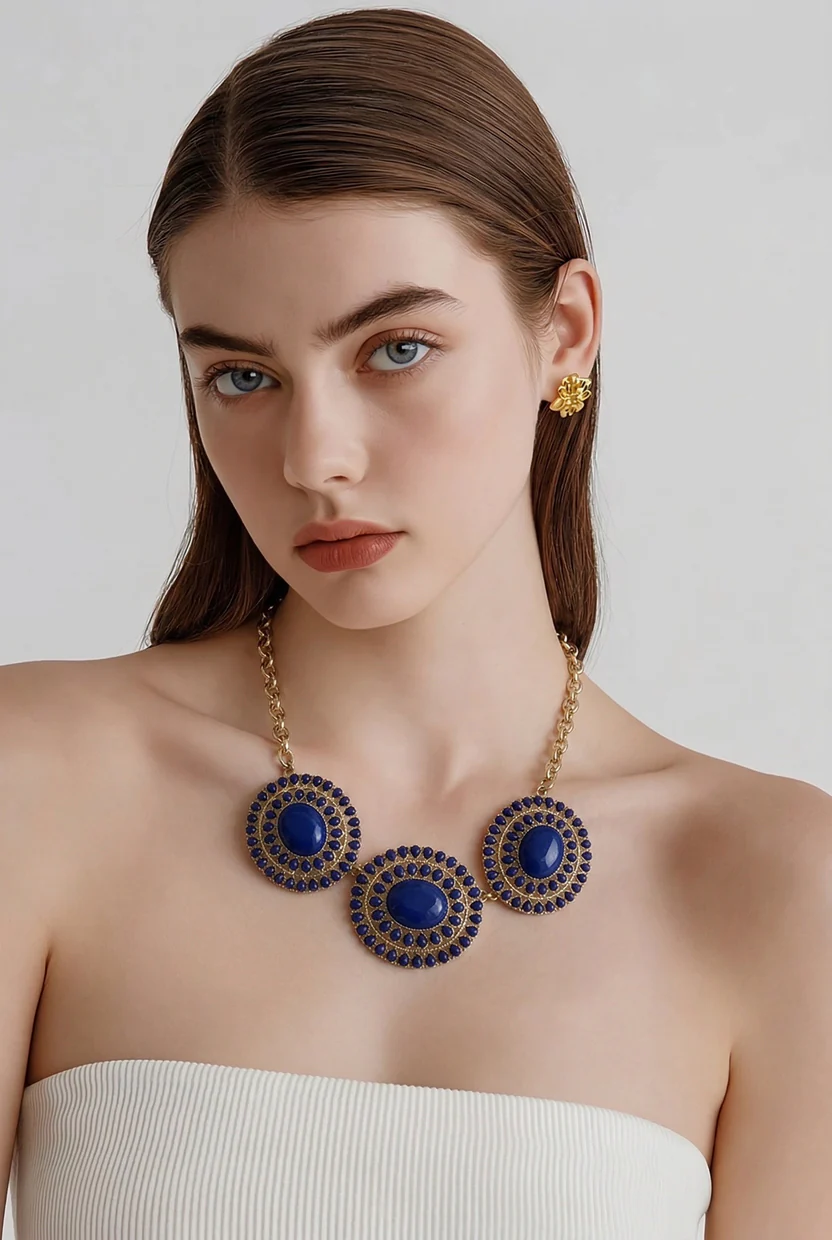 • Pendant: Textured gold-tone medallion with a polished blue oval stone.