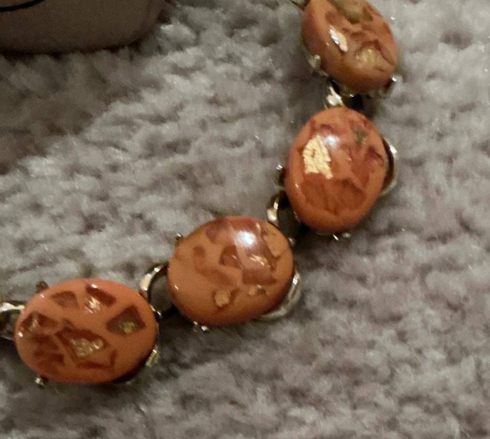 • Confetti Cabochons: The necklace is set with a series of oval-shaped, peach-colored cabochons. Each stone features metallic gold-leaf style inclusions that create a sparkling “confetti” effect within the resin or glass.