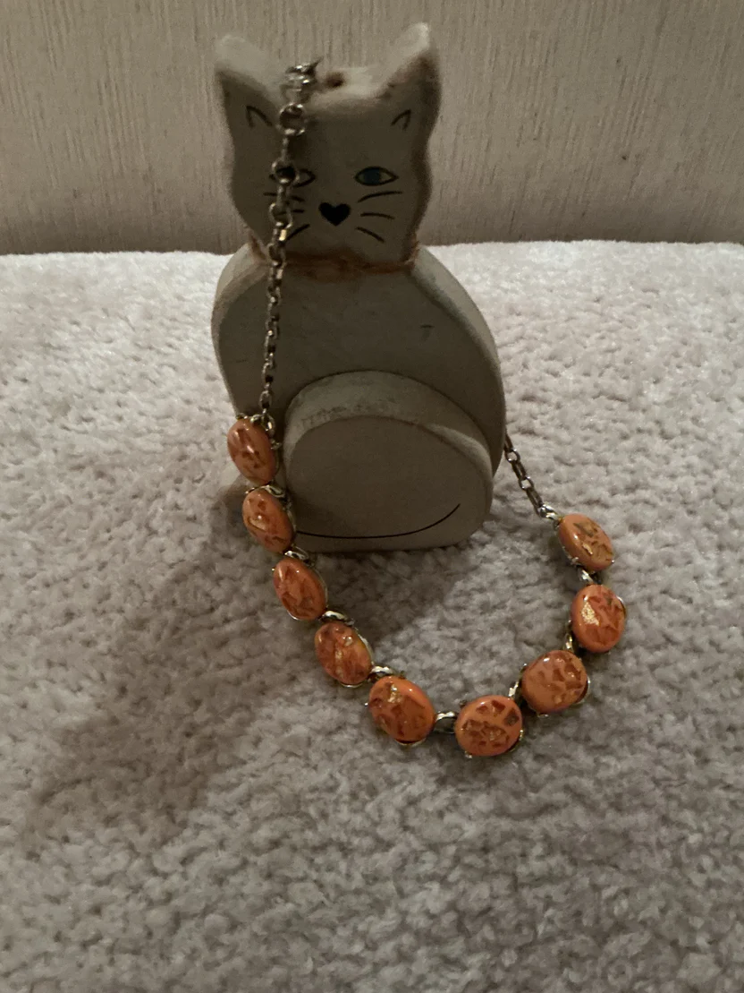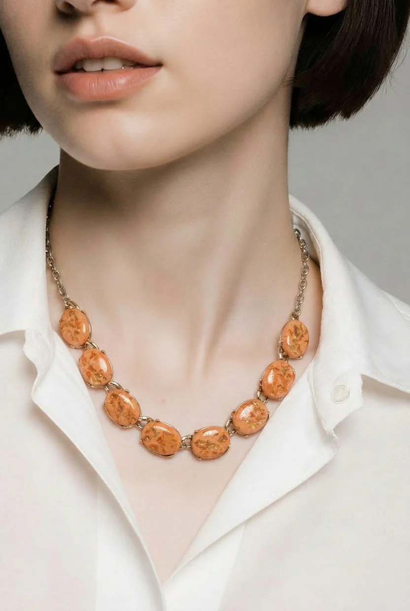 Add a touch of playful retro elegance to your collection with this charming peach-toned station necklace. Featuring a warm, sun-kissed color palette and unique textured inclusions, this piece is perfect for those who love mid-century-inspired “glam” jewelry.
