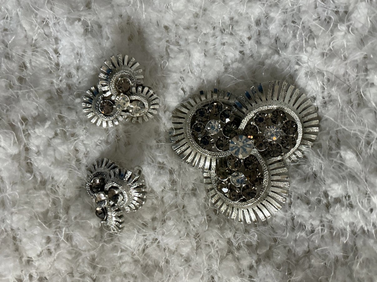 Be the first to review “Coro Silver Tone Sunburst Rhinestone Brooch & Earring Set, Mid-Century Modern Demi-Parure Signed.”