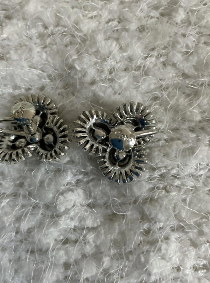 • Design: A three-cluster “sunburst” or “fan” motif. The textured metal creates a radiating “fringe” effect around the stone clusters.