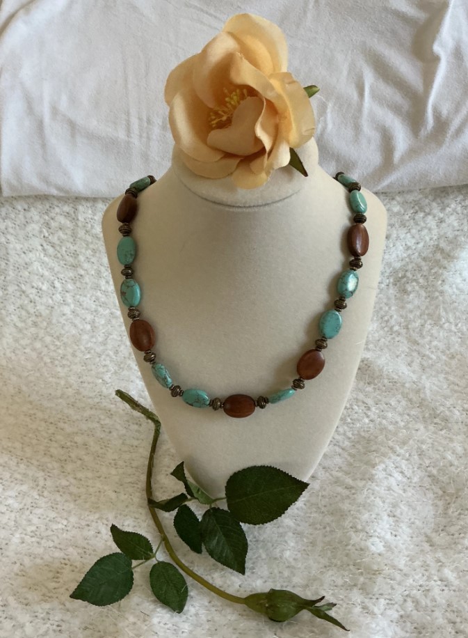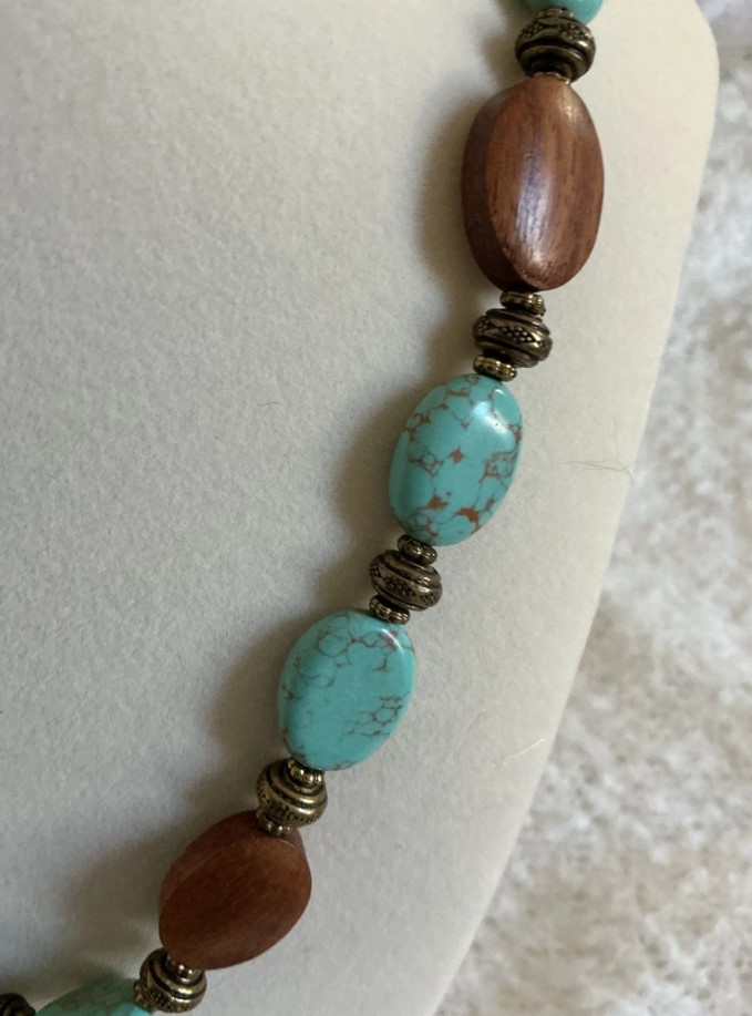 • Materials: A rhythmic combination of natural brown wood beads and turquoise-colored stones (likely reconstituted turquoise or dyed howlite) featuring unique organic marbling.