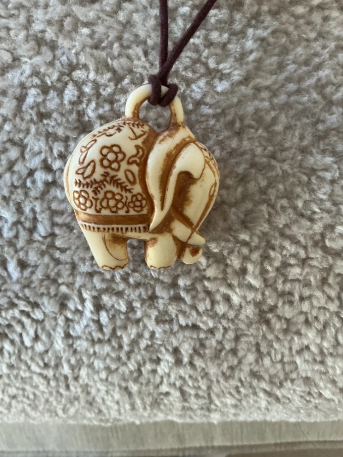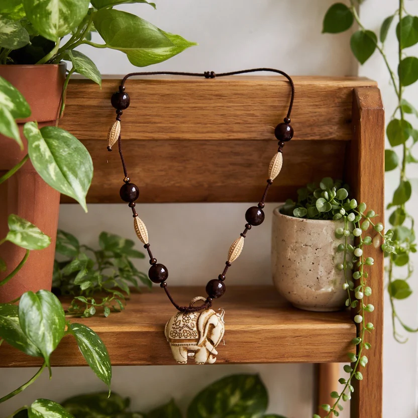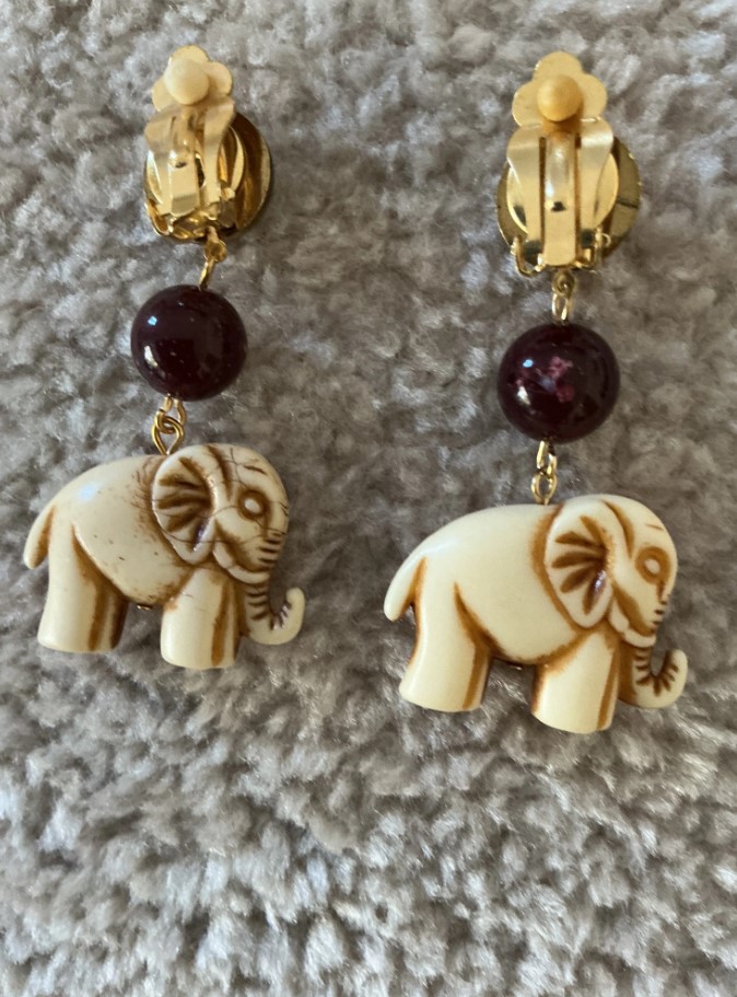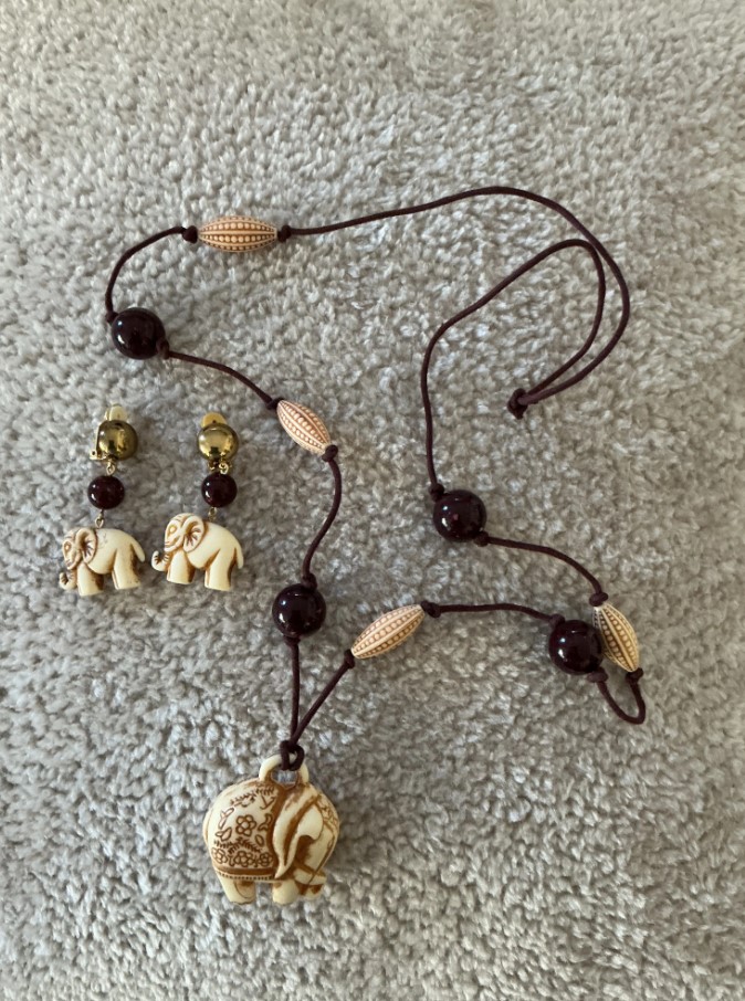 This jewelry set features a charming boho-safari aesthetic, centered around intricately carved elephant motifs. The set includes a long adjustable cord necklace and matching clip-on earrings. The elephant figures are crafted from a cream-colored resin or faux-bovine material with brown recessed detailing to highlight the floral etchings and anatomical features. The necklace is accented with dark cherry-red round beads and cream-colored textured oval beads on a chocolate brown cord, while the earrings feature similar red beads and gold-tone hardware.