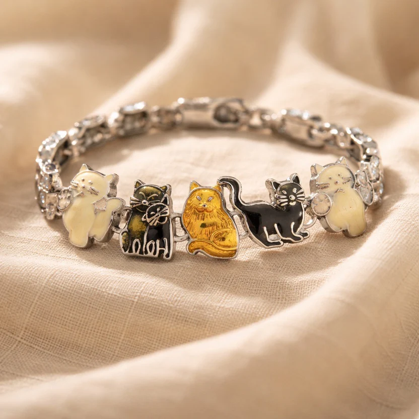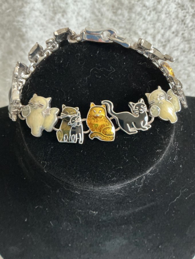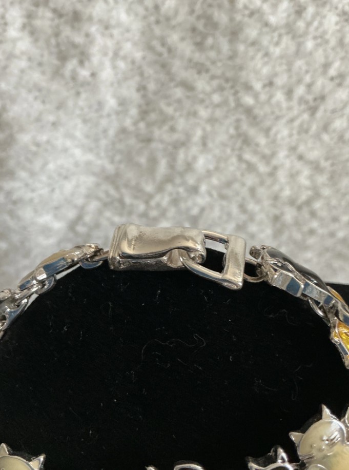 Add a touch of whimsy to your collection with this adorable vintage cat link bracelet. This piece features five detailed feline charms, each with its own unique personality and colorful enamel finish: