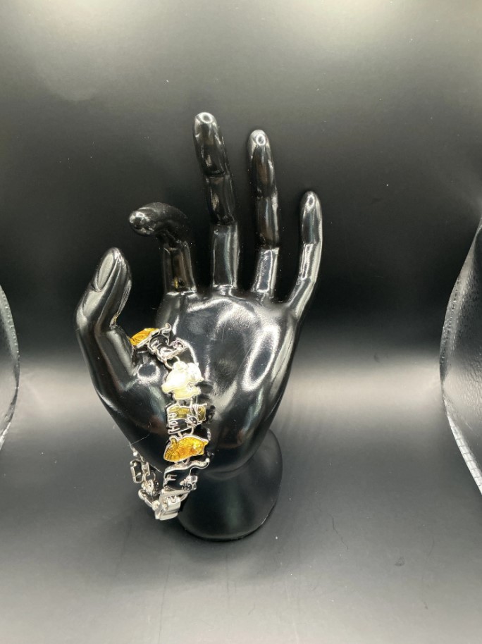 • Material: Silver-tone base metal with vibrant enamel inlay (cream, golden-yellow, grey, and black).