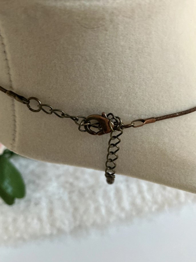 • Chain Details: Suspended from a matching bronze-toned link chain with a secure clasp.