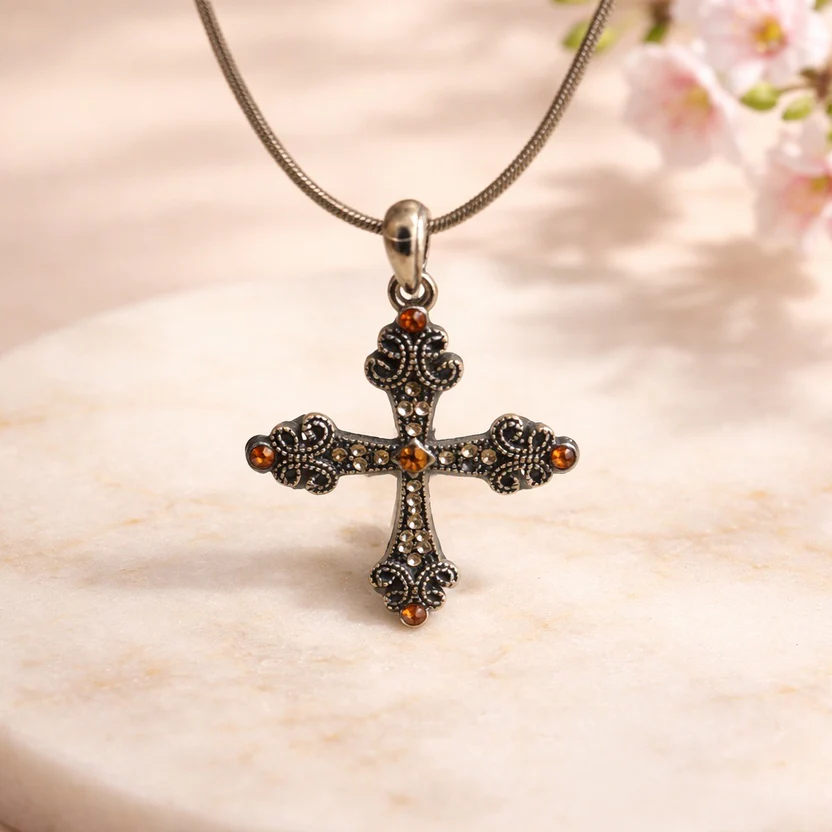 • Design Style: Ornate filigree cross pendant with intricate openwork and scrollwork.