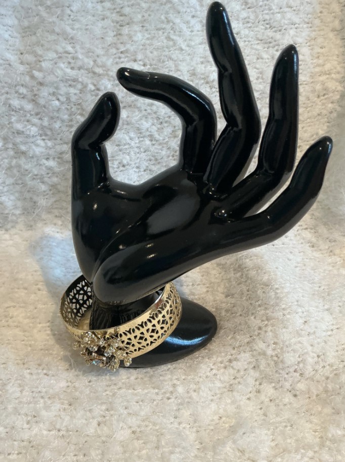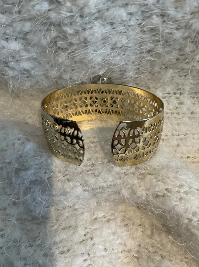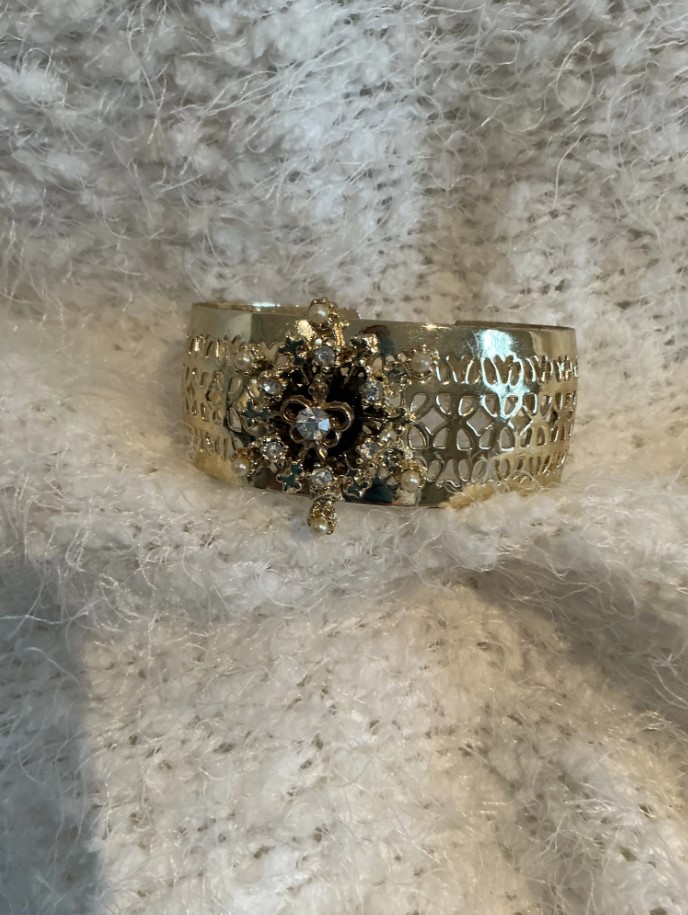 Make a bold statement with this stunning gold-tone cuff bracelet. The piece features an intricate open-work filigree band that leads to a magnificent raised starburst centerpiece. This focal point is embellished with shimmering crystals and delicate faux pearl accents, giving it a timeless Victorian-inspired aesthetic. The open-back cuff design allows for easy wear and an adjustable fit. A beautiful choice for special occasions or for those who love vintage-inspired statement jewelry.
