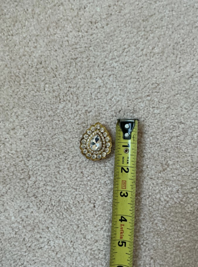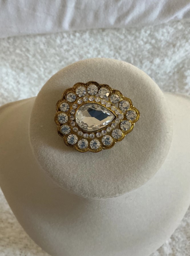 • Design: Intricate teardrop/pear-shaped frame with a pavé-style rhinestone arrangement.