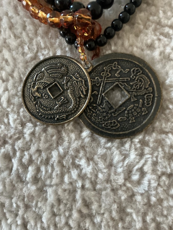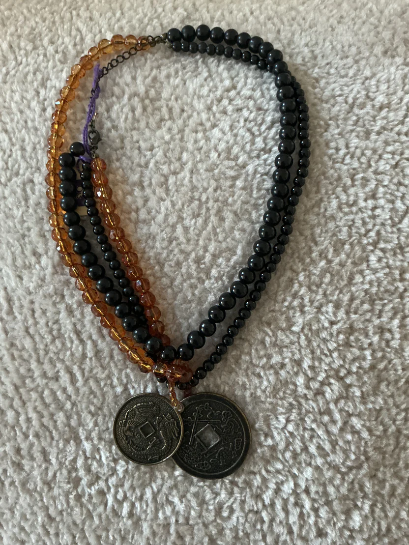 Make a bold cultural statement with this stunning multi-strand Chinese coin necklace. This piece artfully blends traditional Eastern symbolism with bohemian flair, featuring five cascading tiers of beads in deep onyx black and warm honey-amber tones. The alternating textures of the smooth black beads and the glowing, faceted amber accents create a sophisticated, layered look that adds immediate depth to any outfit.