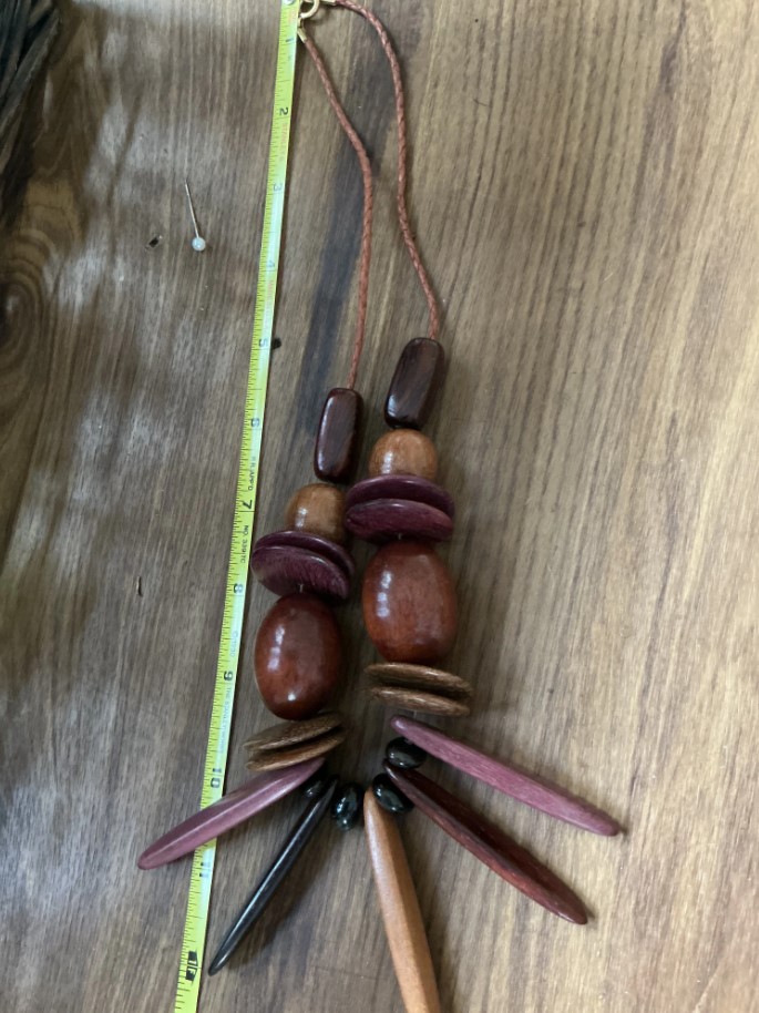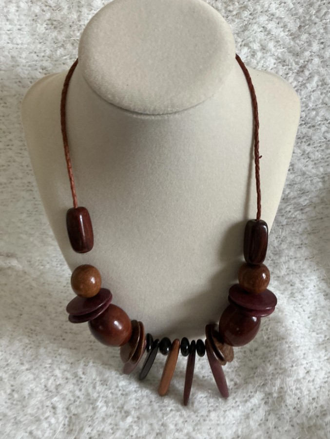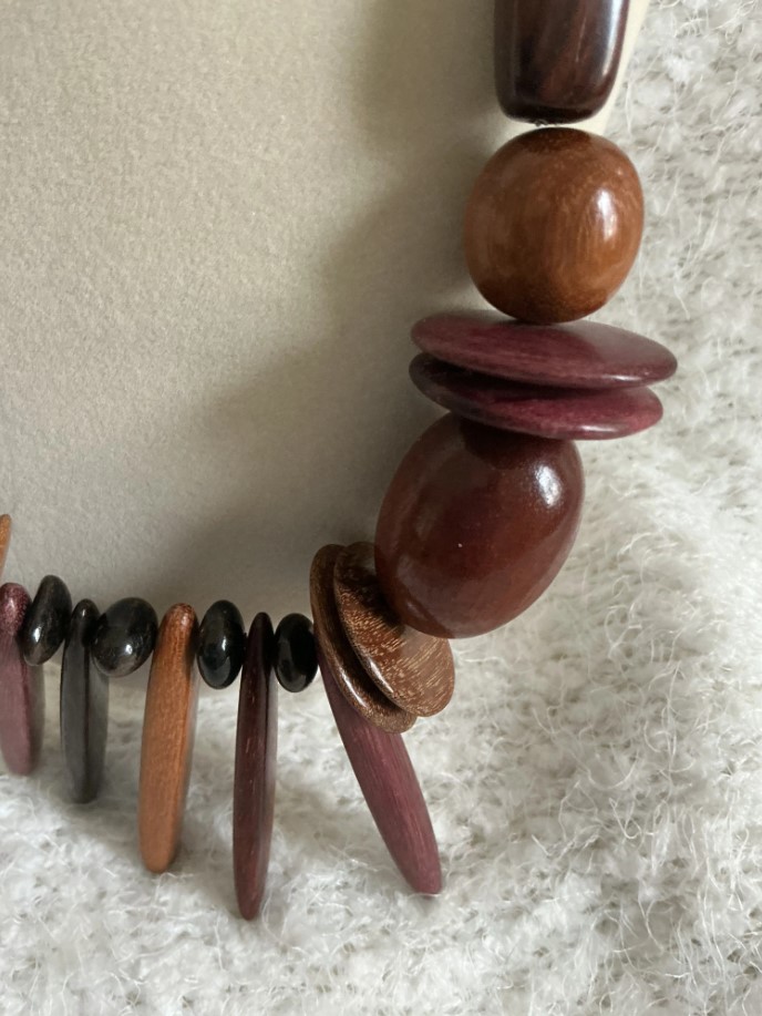 Add an earthy, artisanal touch to your outfit with this unique, handcrafted wooden bead necklace. Featuring a striking combination of dark brown, polished brown, and rich purple-toned wood beads in various shapes—including round spheres, flat discs, and elongated sticks—this necklace offers a beautiful bohemian aesthetic.