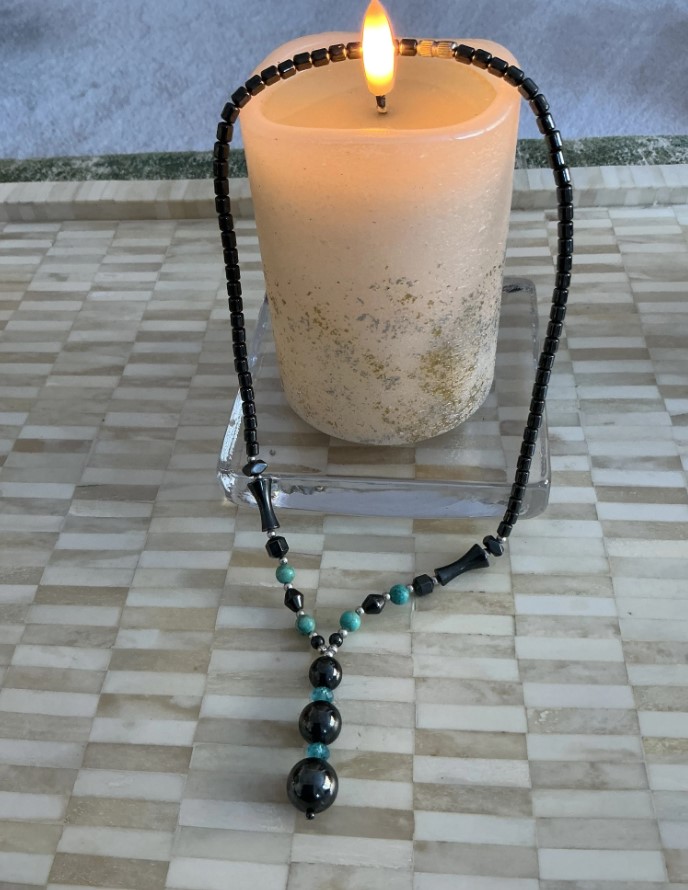 • Design & Silhouette: A Y-neck (lariat style) drop design. The central pendant features three graduated hematite spheres separated by faceted teal glass rondelles, adding a touch of light-catching detail.
