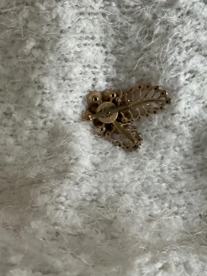 Be the first to review “Mid-Century Pink Rhinestone Floral Spray Brooch, Gold Tone Leaf Pin”