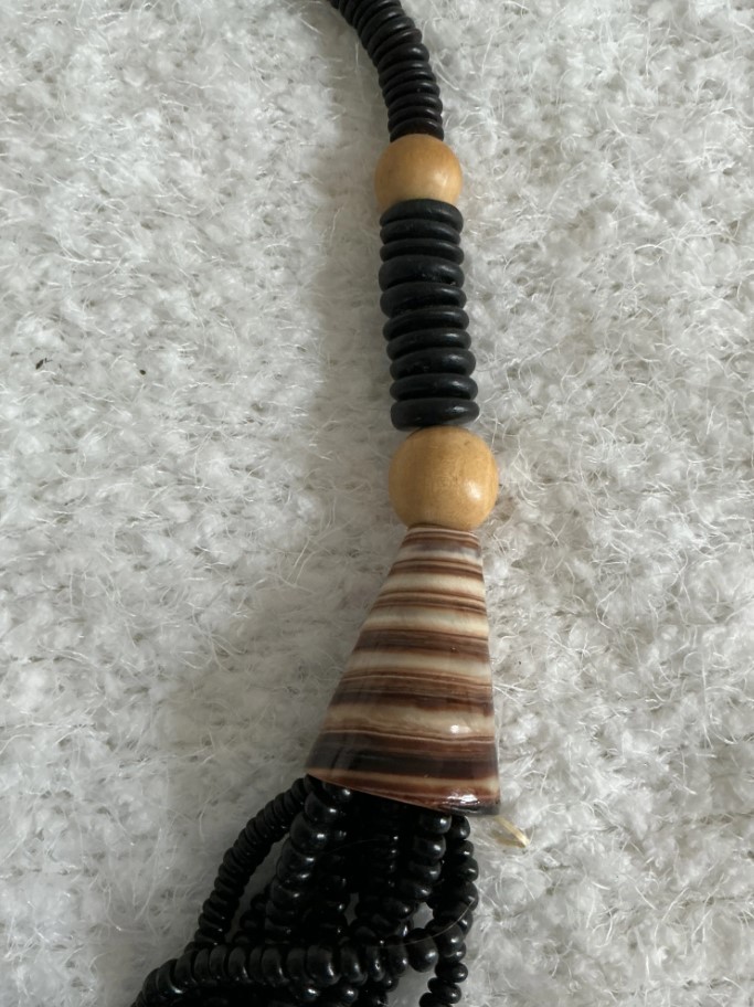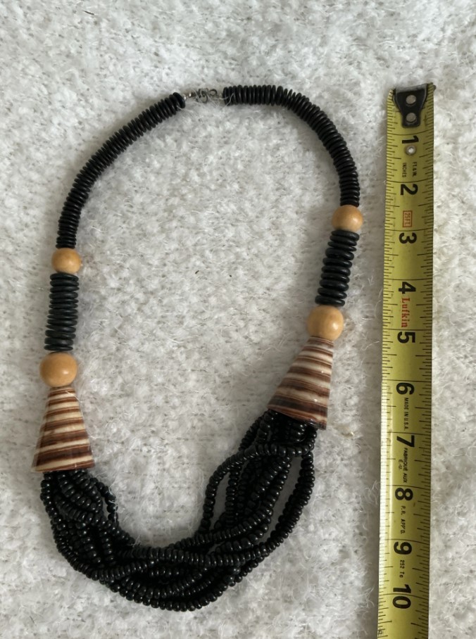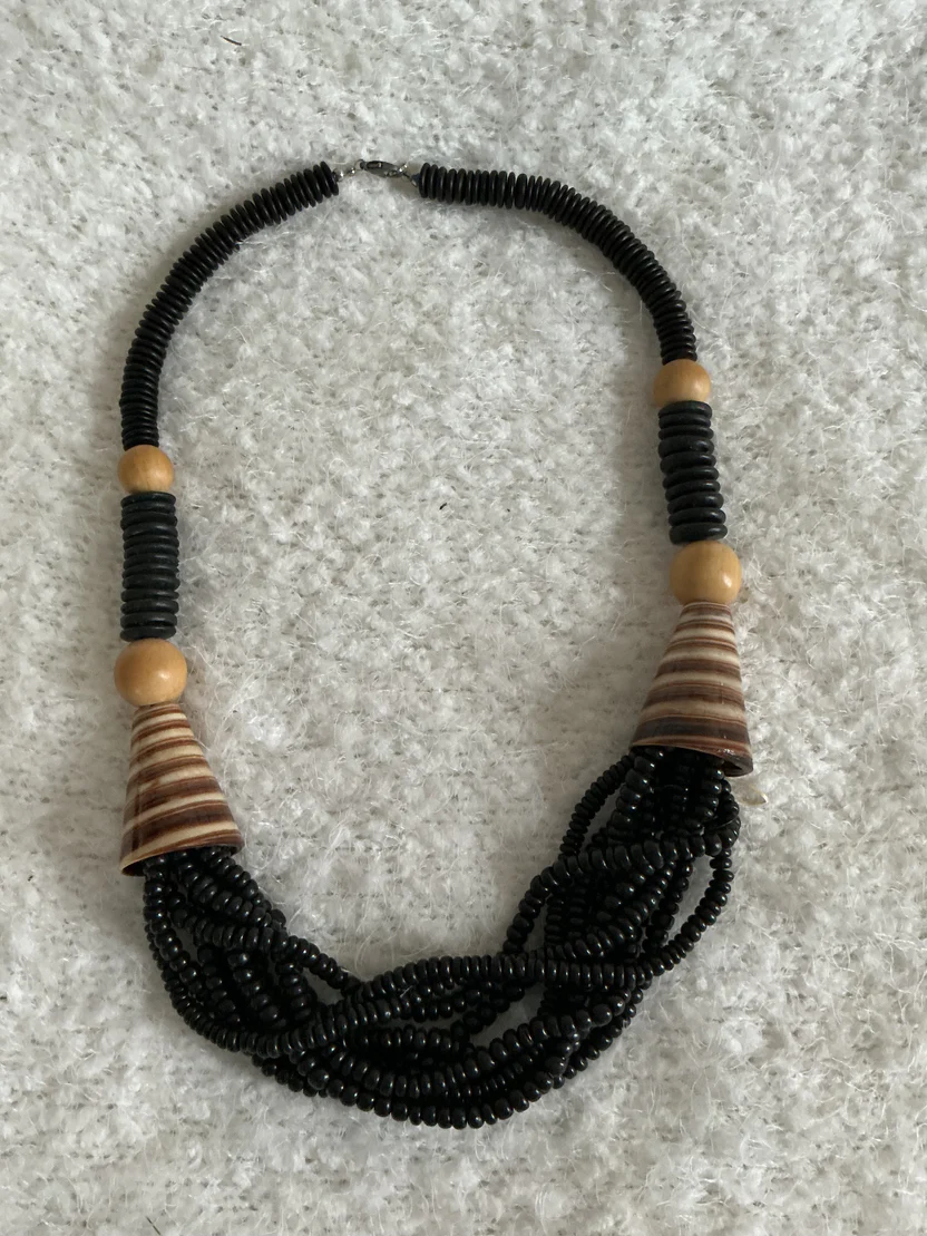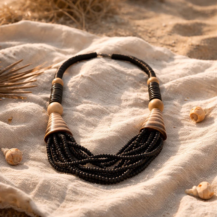 Elevate your bohemian style with this striking multi-strand statement necklace. Featuring a cascade of deep black seed beads, this piece is beautifully accented with hand-selected natural wood beads and polished shell caps. The tiered design creates a rich, textured look that adds a global-inspired flair to both casual tunics and elegant evening wear.