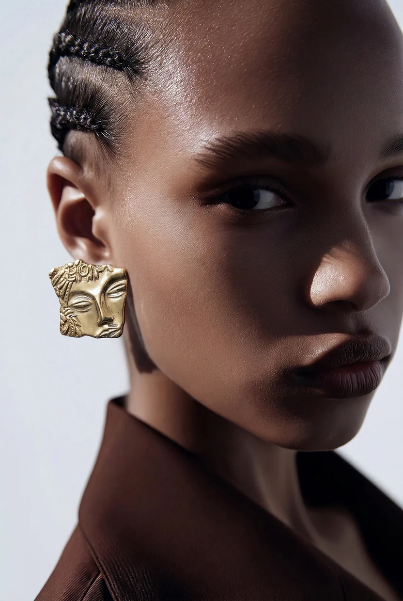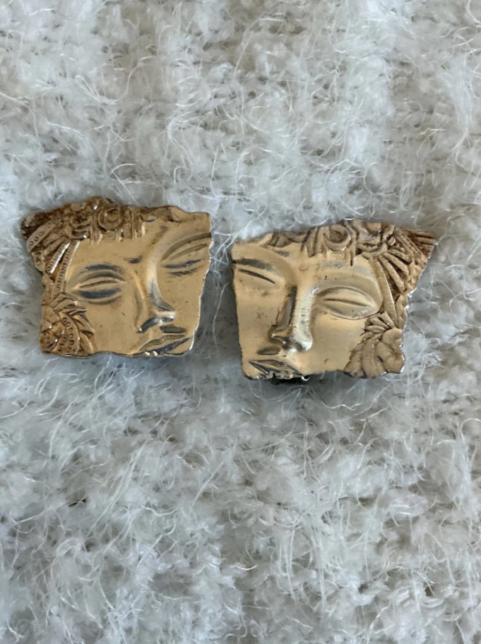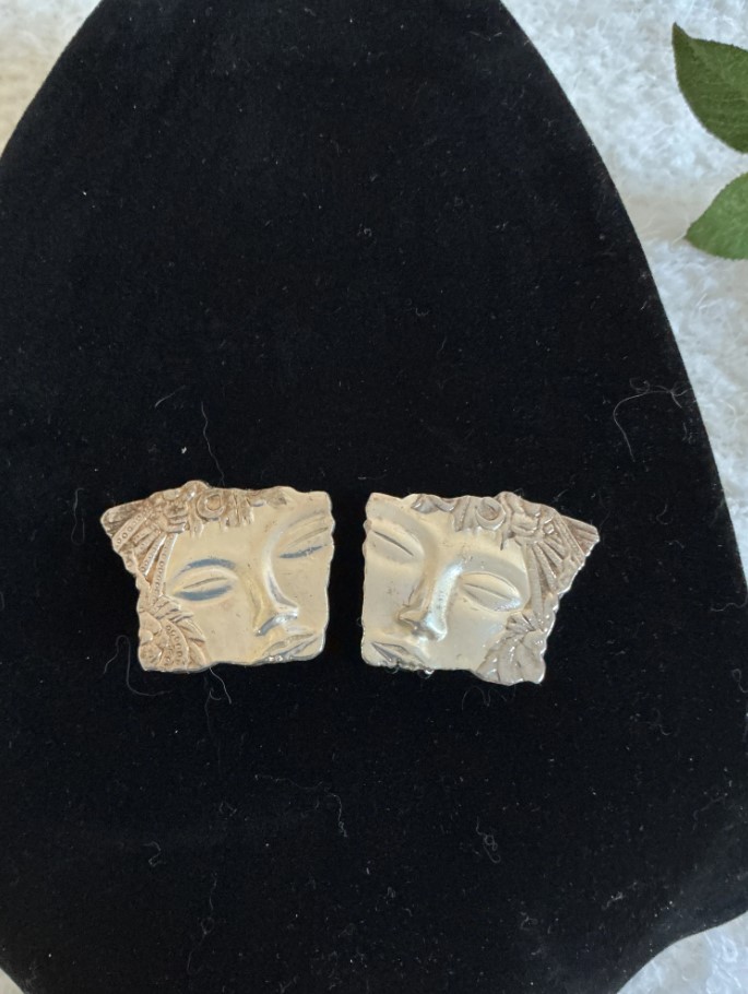 Make a bold artistic statement with these captivating vintage Modernist Face Earrings. These unique clip-ons feature a stylized, high-relief “goddess” or “sunface” mask set against a radiant, textured backdrop that mimics a sunburst or tribal headdress. 1 inch.