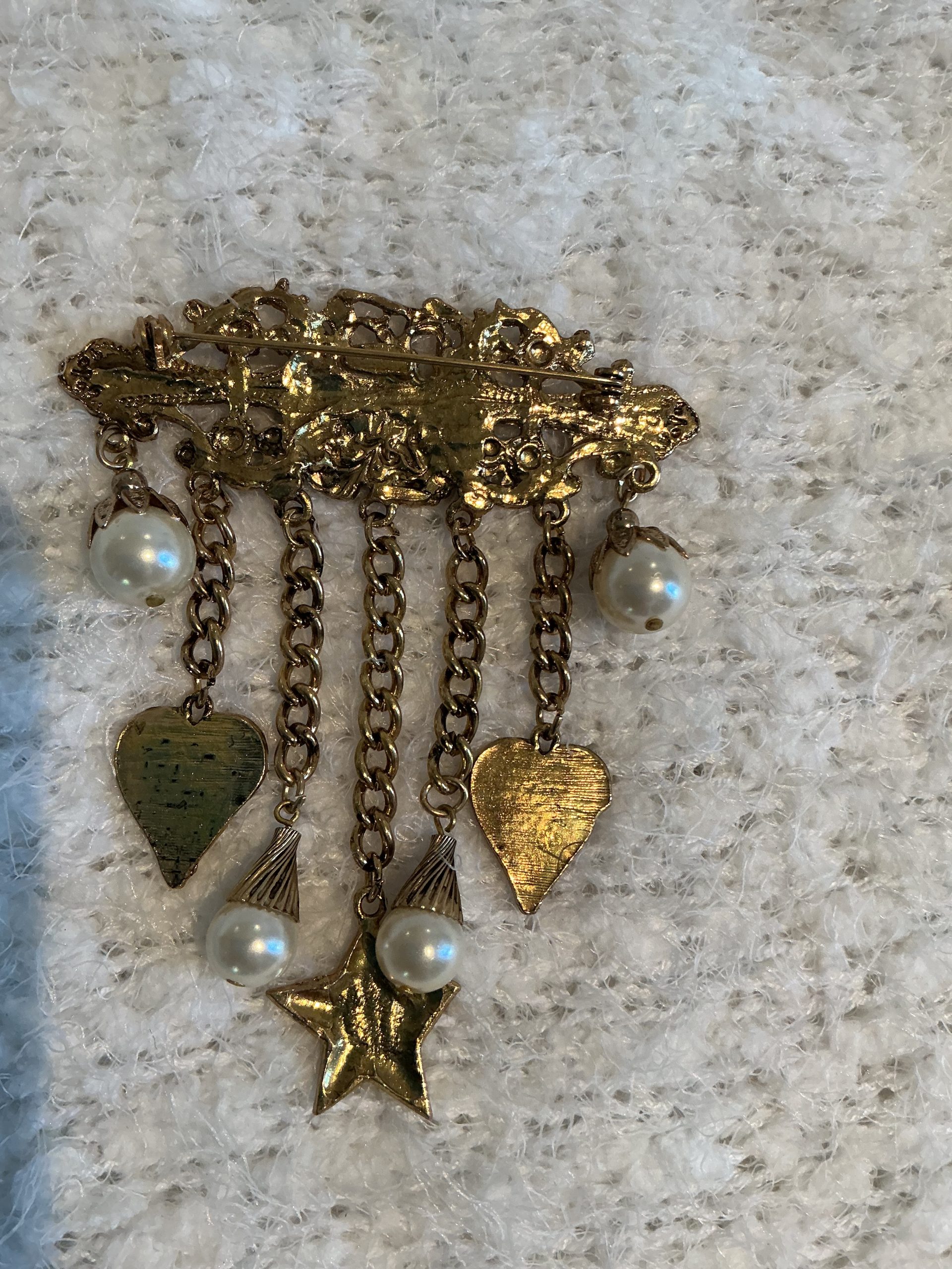 This ornate Victorian Revival brooch features a wealth of symbolic charms. The centerpiece is an intricate gold-tone filigree bar accented with a central faux pearl, from which five layered chains suspend a variety of romantic and celestial drops.