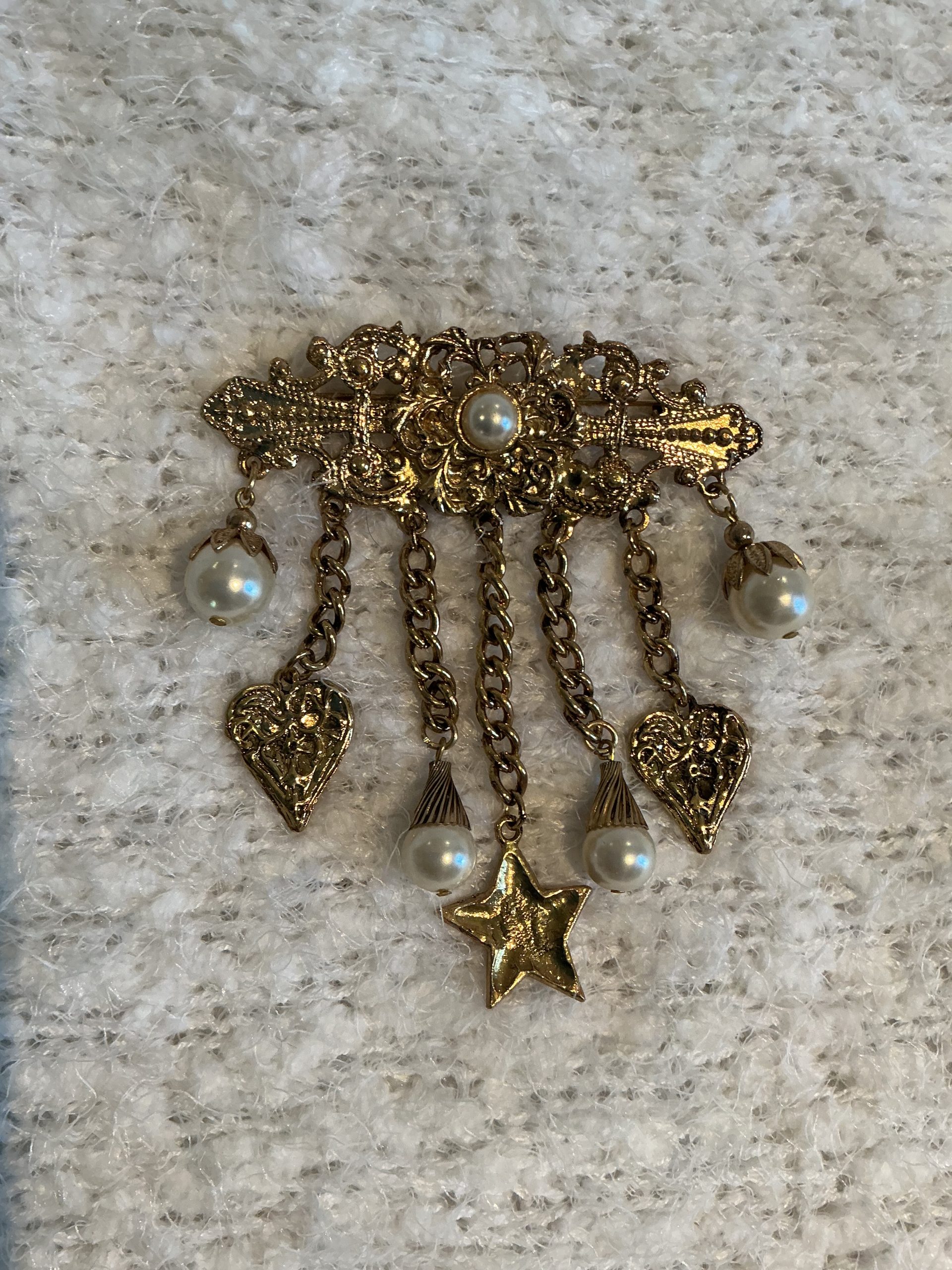 - Motifs: Embossed gold-tone hearts, a polished gold-tone star, and multiple teardrop and round faux pearls.