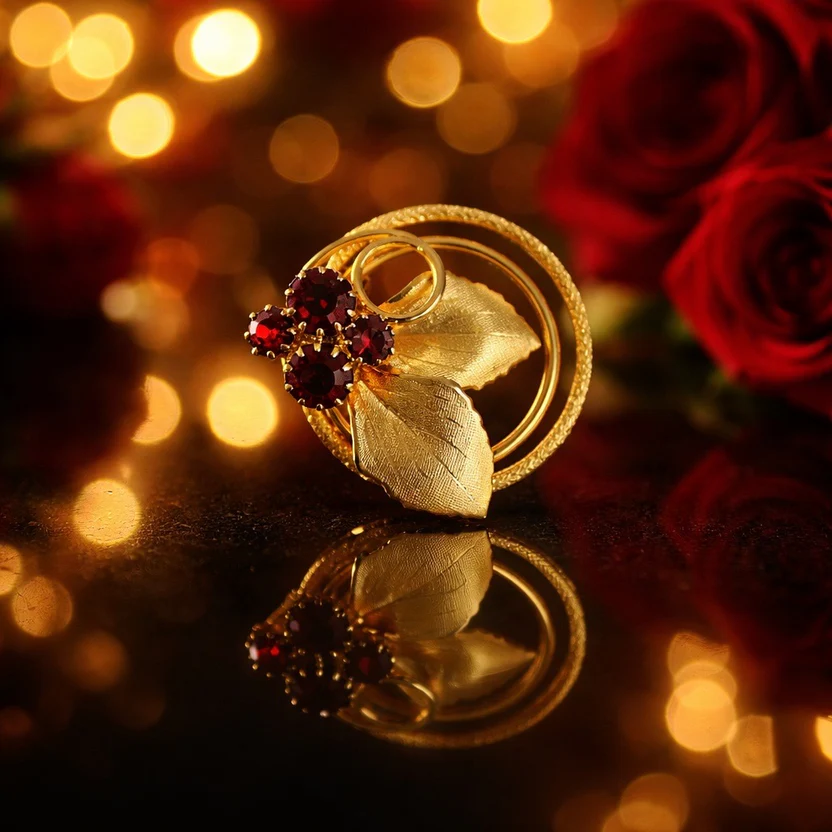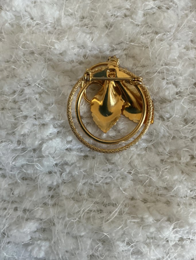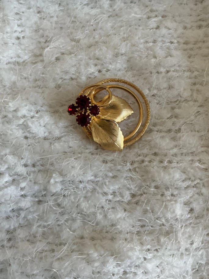 Add a touch of vintage elegance with this gold-tone wreath brooch. The circular design features textured gold leaves surrounding a cluster of vibrant red rhinestones. The brooch is in good vintage condition with a functional, secure pin clasp on the back.