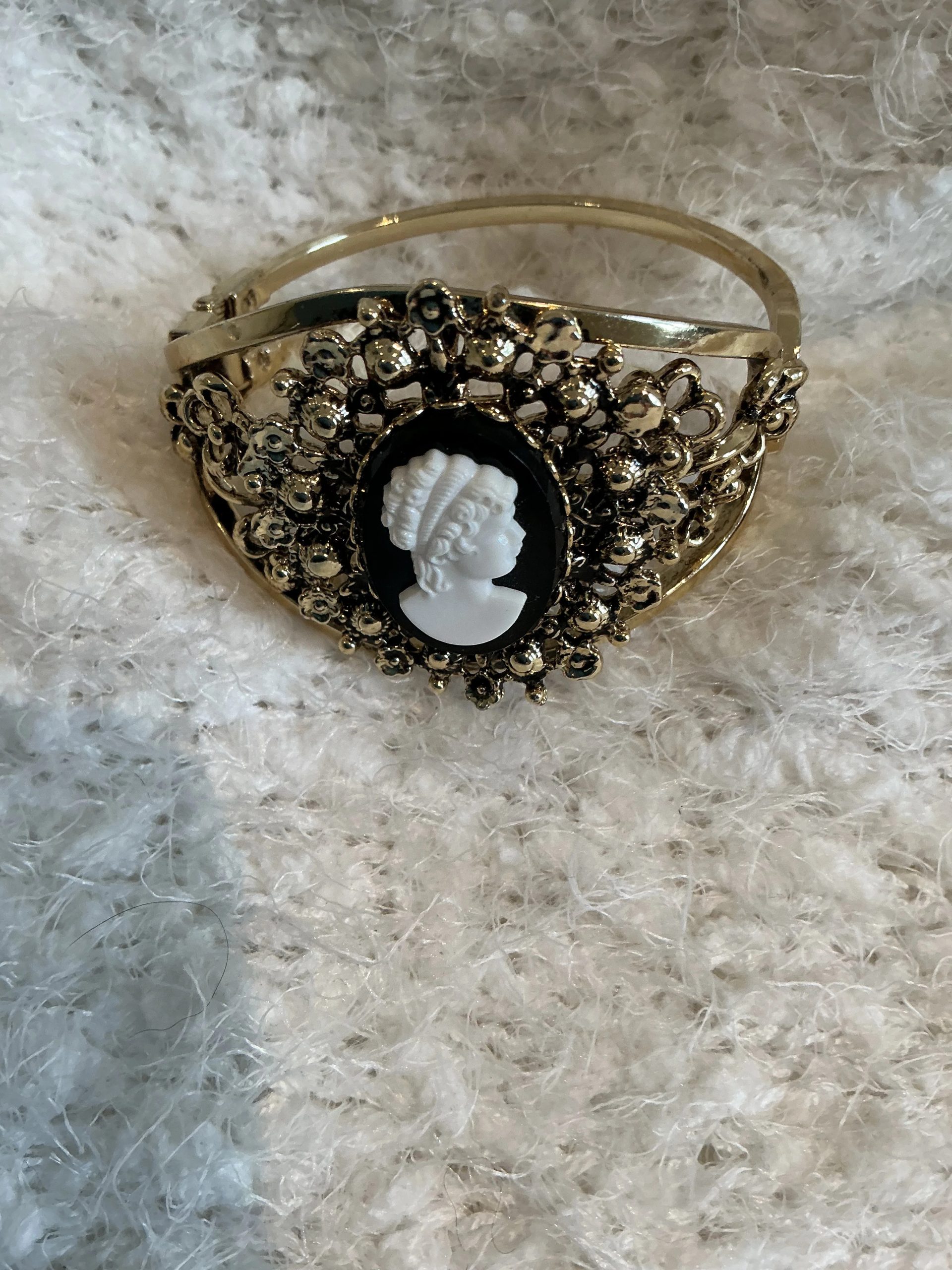 Be the first to review “Retro Black & White Portrait Cameo Bracelet with Gold Openwork Floral Border”