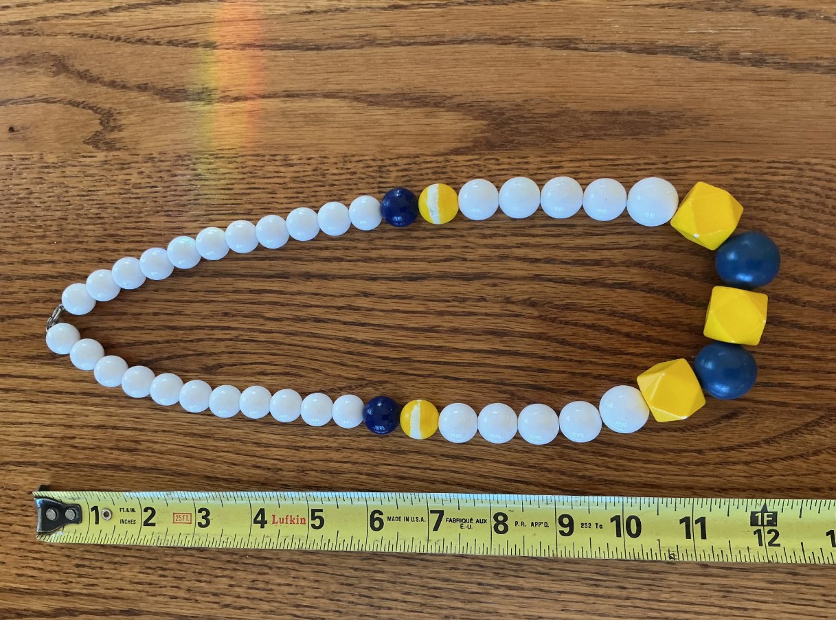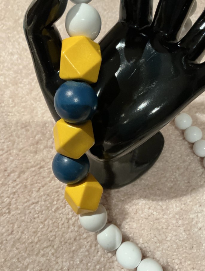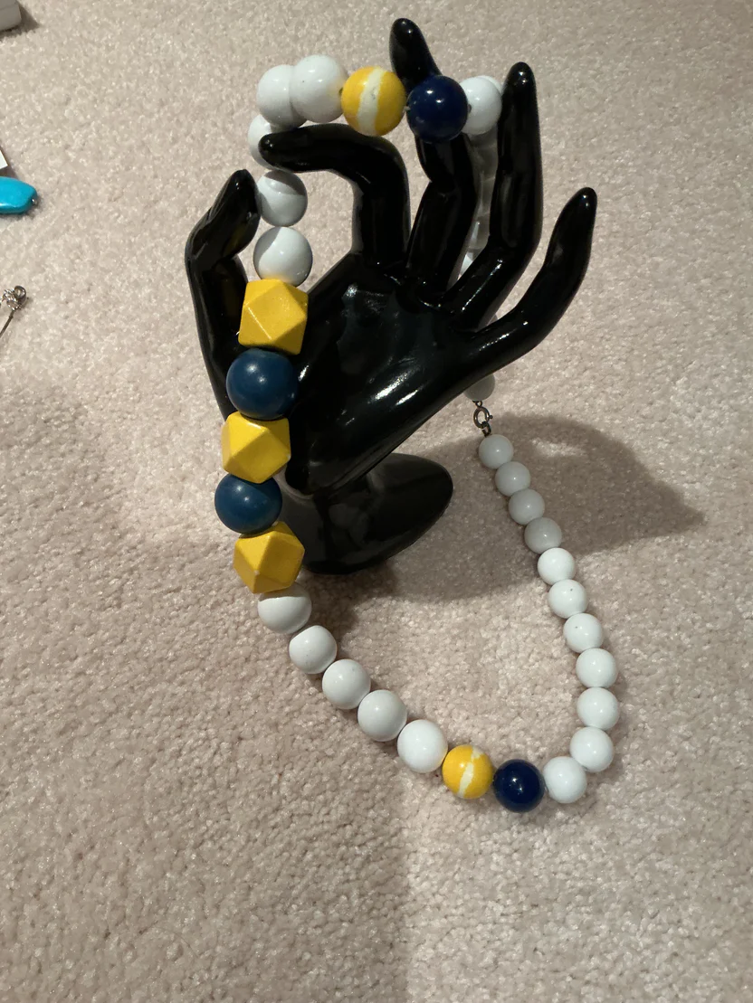 Make a playful and artistic statement with this vibrant multi-shape bead necklace. Featuring a high-contrast color scheme of navy, sunny yellow, and crisp white, this piece draws inspiration from mid-century modern design and classic nautical aesthetics.