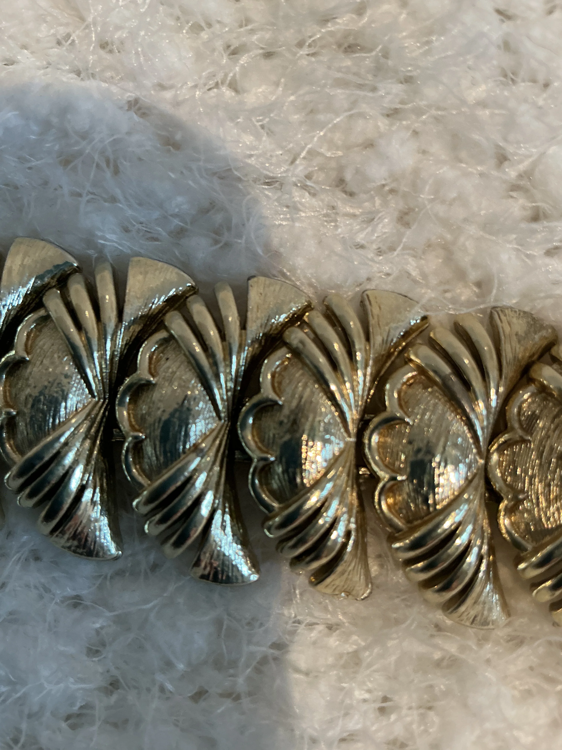 A classic statement piece from the 1960s or 70s, this bracelet features interlocking fan-shaped links with a beautiful ribbed texture. Its substantial width and bright gold-tone finish make it a perfect accessory for both vintage enthusiasts and modern styling.