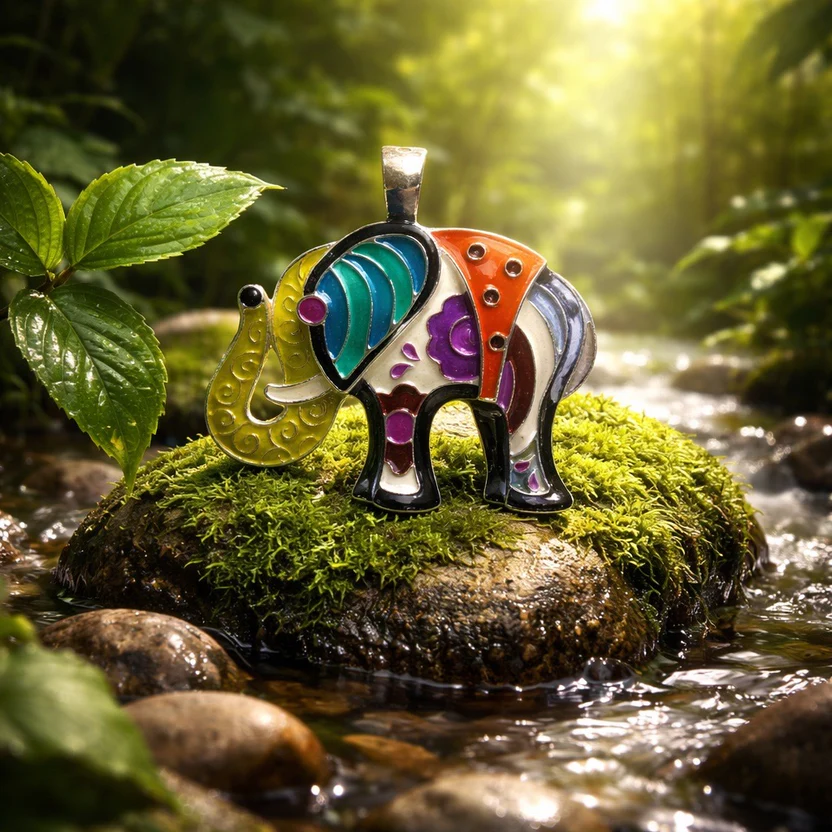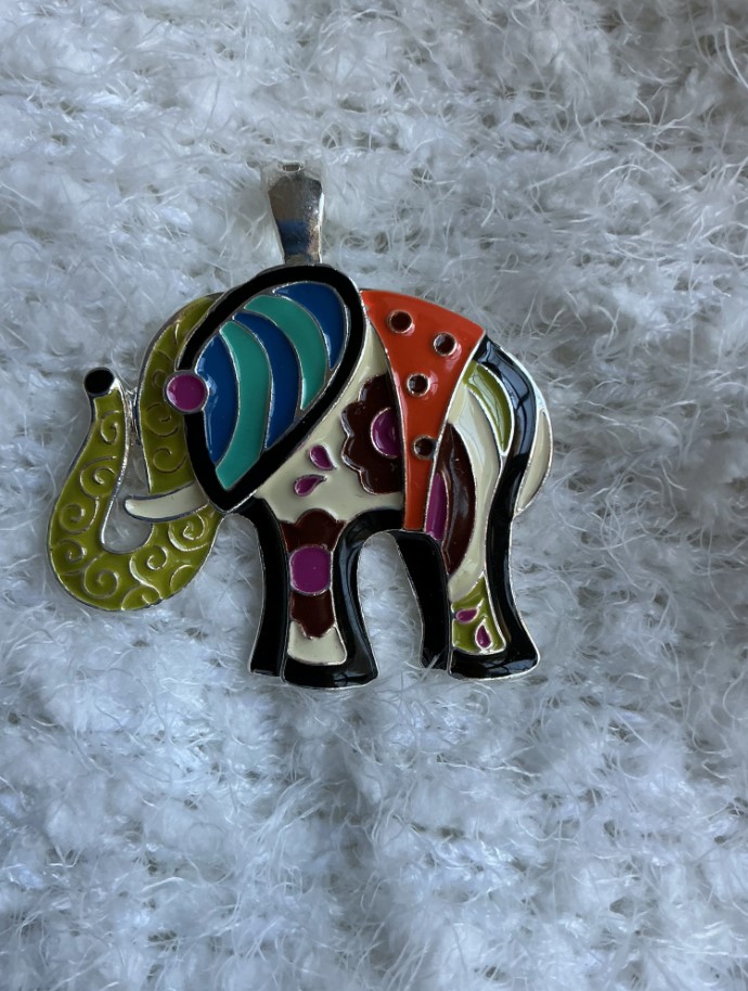 Crafted by the Roman Company (RMN), this whimsical piece features a stylized elephant with its trunk raised—a traditional symbol of fortune and positivity. The pendant is decorated with a beautiful “cloisonné style” cold enamel finish in a palette of forest green, royal blue, burnt orange, and deep purple, all set within bright silver-tone outlines.