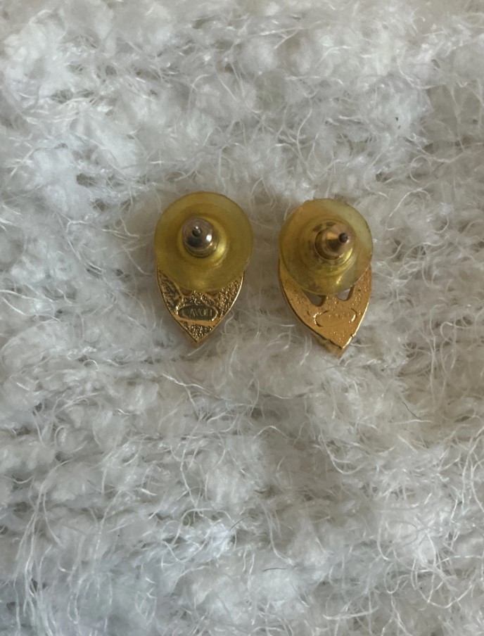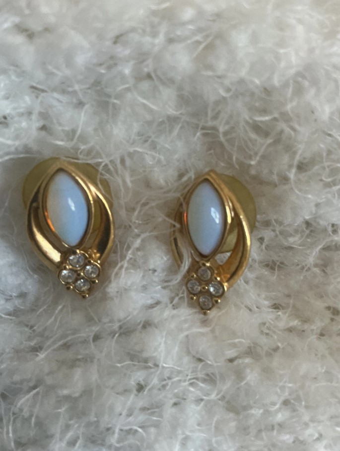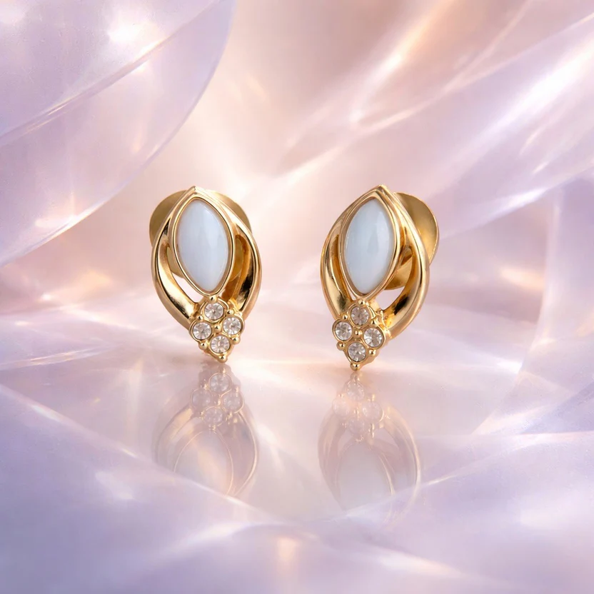 Add a touch of vintage elegance to your collection with these beautiful signed Avon earrings. Featuring a delicate teardrop design, these gold-tone post earrings showcase a smooth, milky white opalescent cabochon stone at the center. At the base of the teardrop, a cluster of four sparkling clear rhinestones adds a hint of glamour. Perfect for dressing up a casual outfit or complementing evening wear.