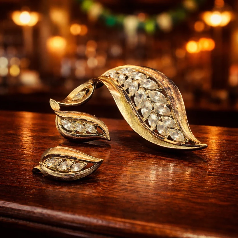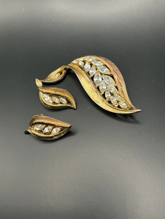 • Design: A “demi-parure” set (matching brooch and earrings) featuring a textured, brushed gold-tone leaf motif.