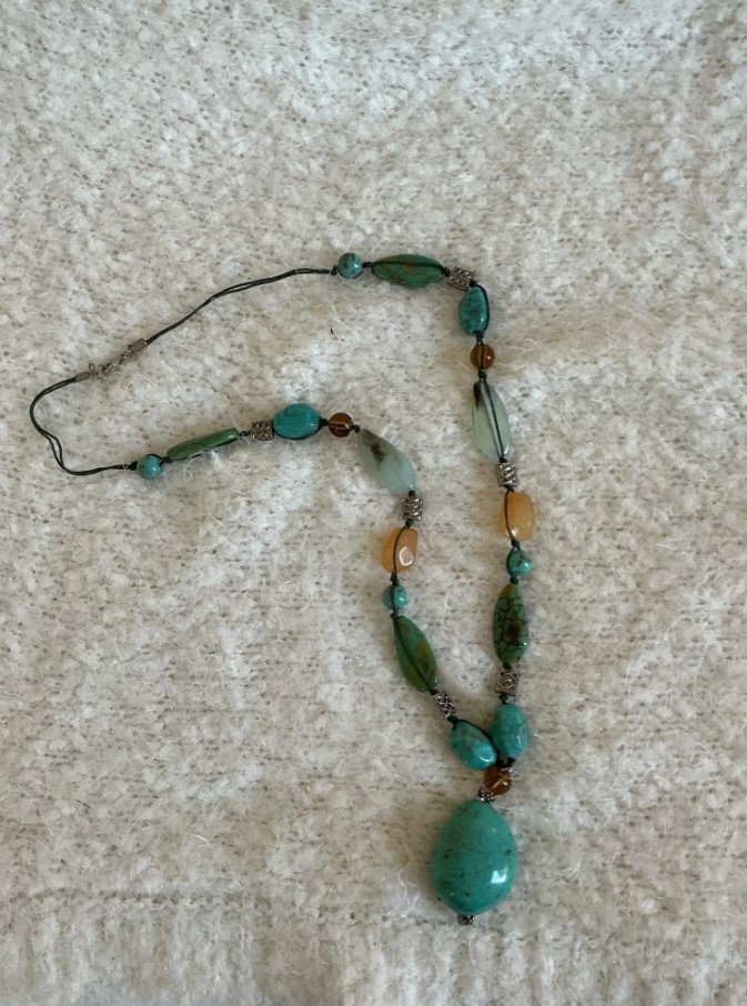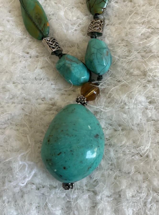 • Pendant: A large, smooth, teardrop-shaped turquoise-colored stone (likely dyed howlite or magnesite) with natural-looking matrix flecks.
