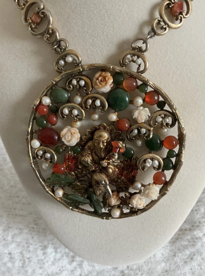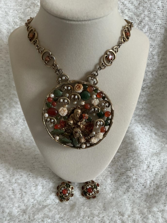 This exquisite vintage jewelry set from Swoboda features a large, ornate pendant necklace and matching clip-on earrings. The pieces are crafted in a warm gold tone and embellished with genuine, small, hand-set gemstones, including green jade, red carnelian, and tiny white pearls.