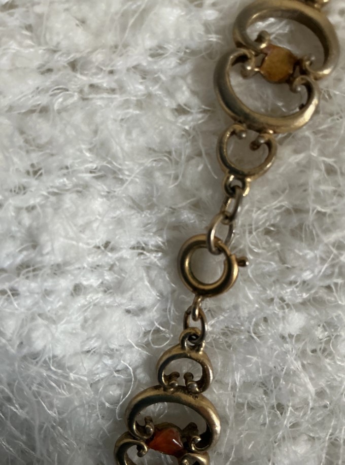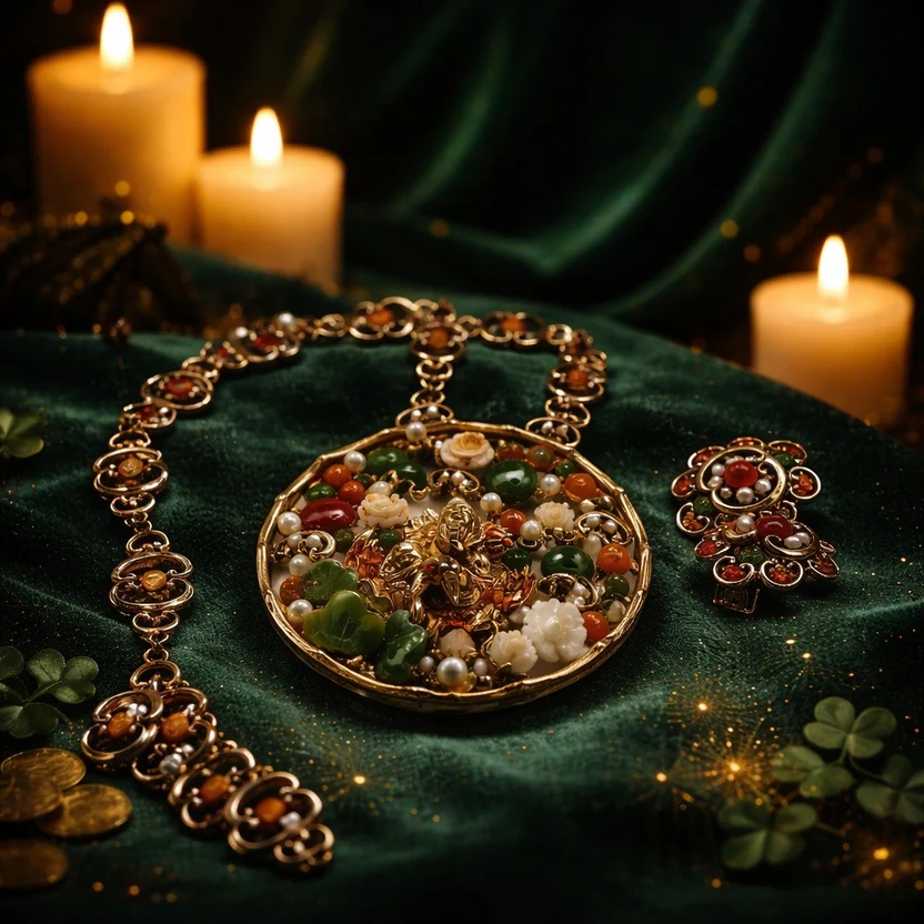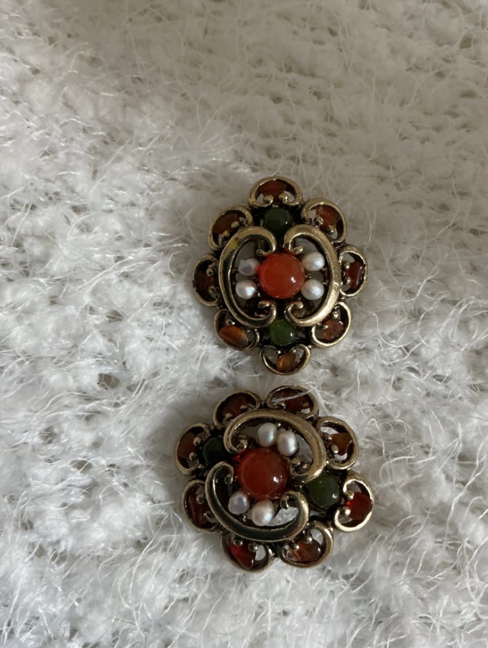 • Earrings: The matching clip-on earrings feature a floral filigree design with a central red carnelian bead surrounded by pearls and jade.