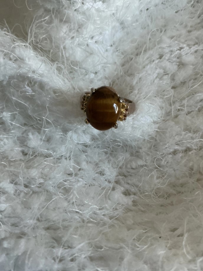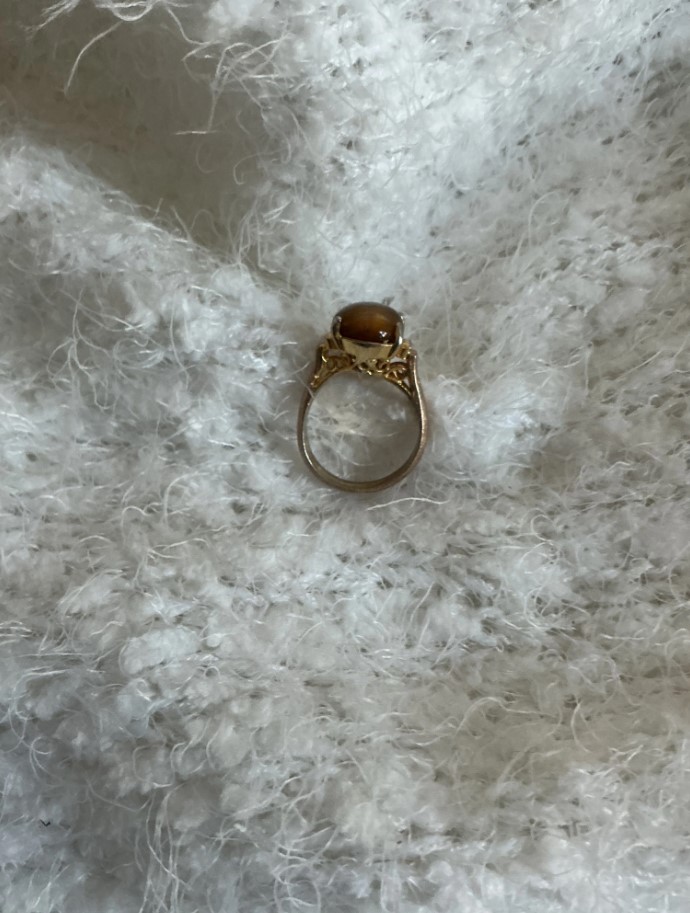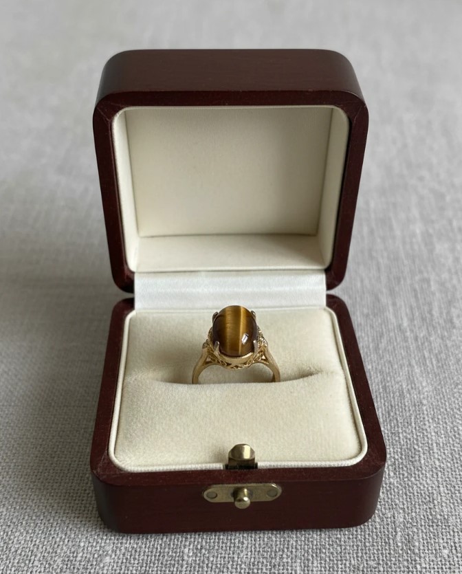 This striking vintage statement ring features a large, oval-cut Tiger’s Eye cabochon set in a classic mid-century style. Known for its captivating “chatoyancy,” the stone displays a shimmering band of light that shifts beautifully as it catches the sun. The ornate filigree basket setting provides an elegant, antique-inspired silhouette perfect for any vintage lover.