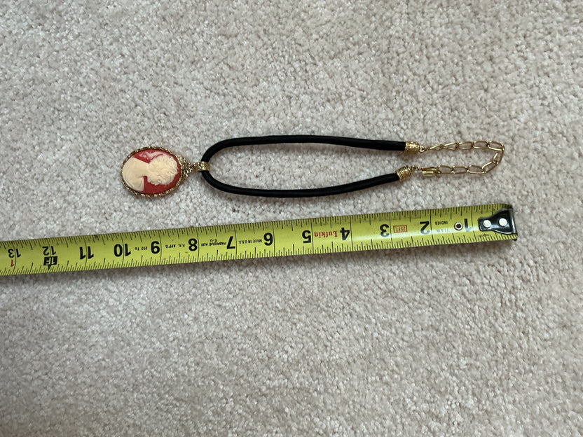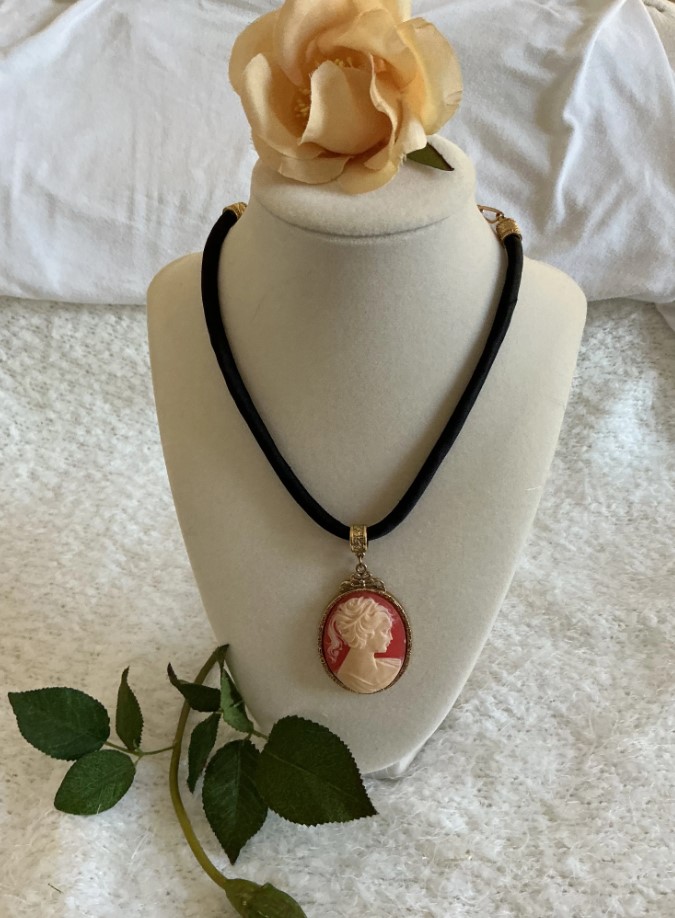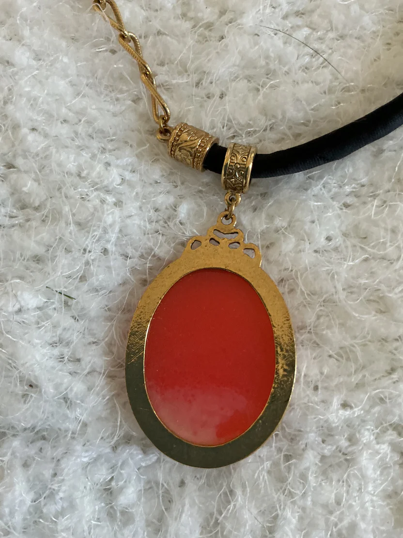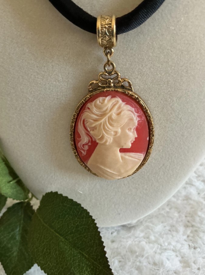 • Material: The cameo appears to be molded resin or plastic, a common material for “Victorian Revival” costume jewelry from the 1960s–1980s. The smooth, uniform texture and lack of carving marks suggest it was cast rather than hand-carved from shell or stone.