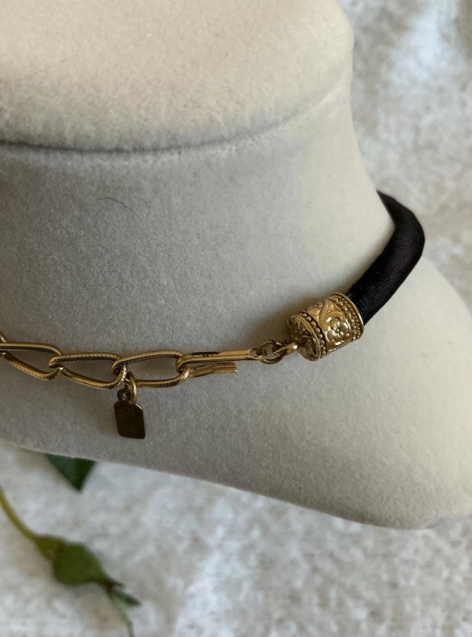 • Necklace Style: It features a black satin or silk-wrapped cord, accented with decorative gold-tone end caps and a “J-hook” or “S-hook” clasp with an extender chain.