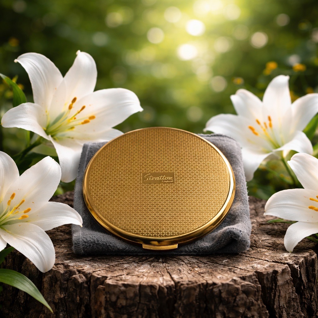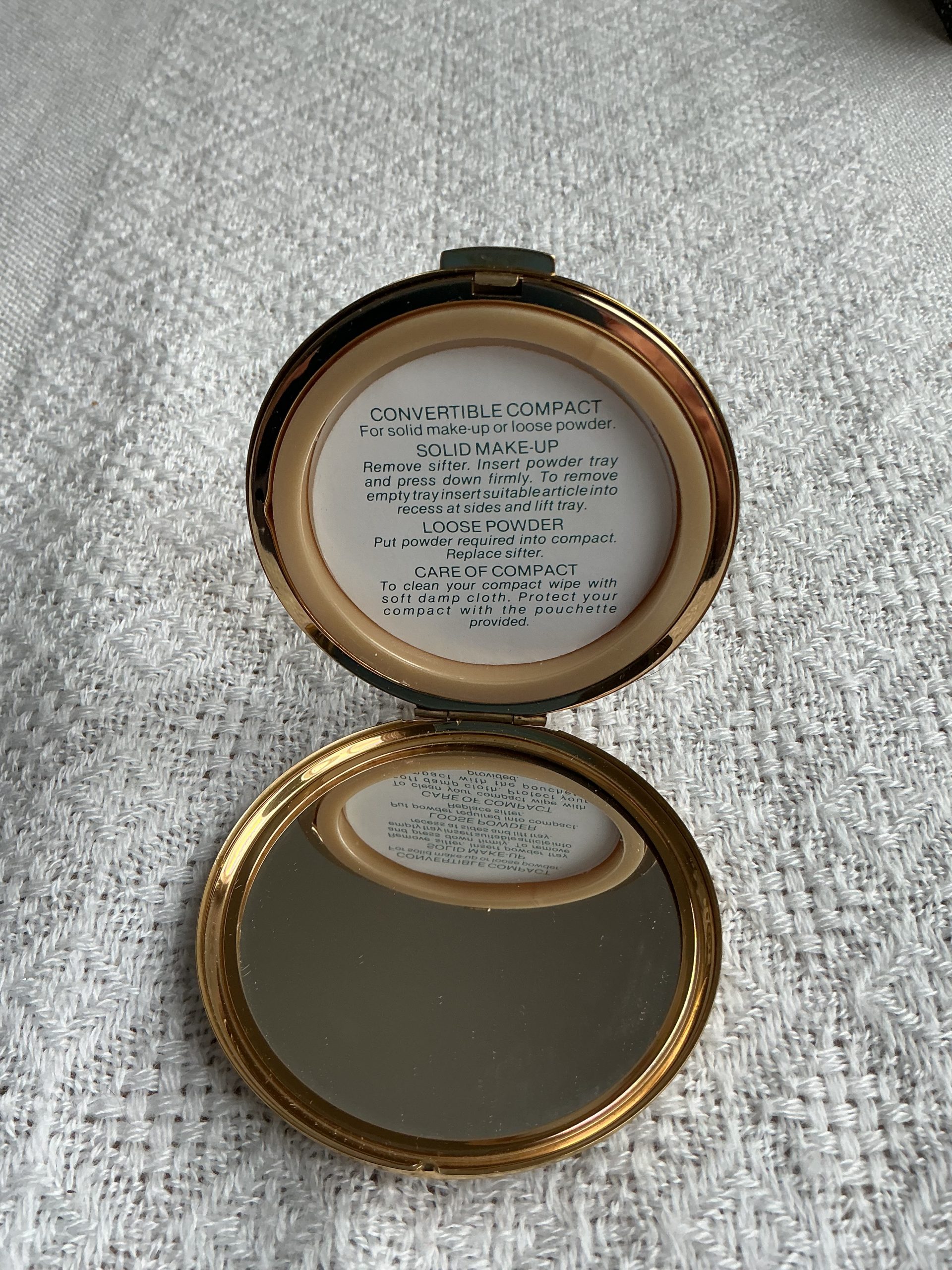 • Interior: Includes the original high-quality mirror and the factory instructional paper insert explaining how to switch between solid and loose powder. It also features the patented “self-opening” inner lid mechanism.
